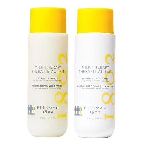 Beekman 1802 Milk Therapy Shampoo and Conditioner Set What It Is This set by Beekman 1802 helps cleanse and condition your hair to help improve the look of frizz and add shine to the cuticle for hair that looks and feels smoother.   What You Get 8 fl. oz. Milk Therapy Shampoo 8 fl. oz. Milk Therapy Conditioner What It Does Shampoo Contains glycerin, a humectant that attracts moisture to the hair shaft Contains dimethicone, which provides a mixture of low and high molecular weight silicones that help provide greater slip and a satiny after-feel, smooths, temporarily adds the look of shine and helps temporarily improve the look of frizz Contains Cetrimonum Chloride, which provides temporary anti-static, anti-frizz, and detangling properties and helps to softening coarse hair Contains hydrolyzed collagen Contains Polyquaternium-7, which improves emollience and gloss to the hair and helps to smooth the cuticle   Conditioner Contains glycerin, a humectant that attracts moisture to the hair shaft Contains dimethicone, which provides a mixture of low and high molecular weight silicones that help provide greater slip and a satiny after-feel, smooths, temporarily adds the look of shine and helps temporarily improve the look of frizz Contains Cetrimonum Chloride, which provides temporary anti-static, anti-frizz, and detangling properties and helps to softening coarse hair Contains hydrolyzed collagen Contains Polyquaternium-7, which improves emollience and gloss to the hair and helps to smooth the cuticle