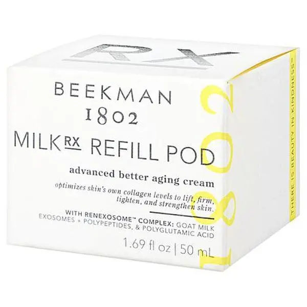 Beekman 1802 MilkRX Advanced Renexosome Cream Refill Pod What It Is Beekman 1802 Milk RX Advanced Better Aging Cream is a rich cream that provides an anti-aging beauty benefit due to its combination of goat milk, Reneseed polypeptide, polyglutamic acid, and other key ingredients, for a cream that helps reduce signs of aging, temporarily brightens the look of skin, and moisturizes to temporarily plump the look of skin.  What You Get 1.69 fl. oz. MilkRX Advanced Renexosome Cream What It Does Contains reneseed, which helps reduce the appearance of fine lines and wrinkles Contains polyglutamic acid, an anionic amino acid that provides hydration, nourishing skin with moisture Polyglutamic acid is a multi-functional moisturizer that provides a slow-releasing transport system for hydration Contains allantoin, a skin care ingredient with moisturizing properties helping to give skin a smooth looking and healthy-looking appearance Contains hydrolyzed collagen   Consumer Perception Survey In a consumer perception survey, 100% of participants agreed that the Milk RX instantly made their skin feel moisturized. In a consumer perception survey of 94% of participants, using as directed for eight weeks agreed the Milk RX helped give them more youthful looking skin, and helped their skin look healthier. In a consumer perception survey of participants using as directed for four weeks: 91% agreed the Milk RX helped their skin look healthier 94% said their overall skin appearance improved 100% agreed Milk Rx made their skin feel moisturized