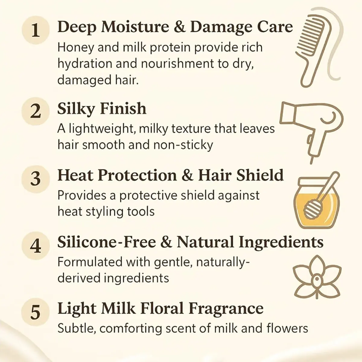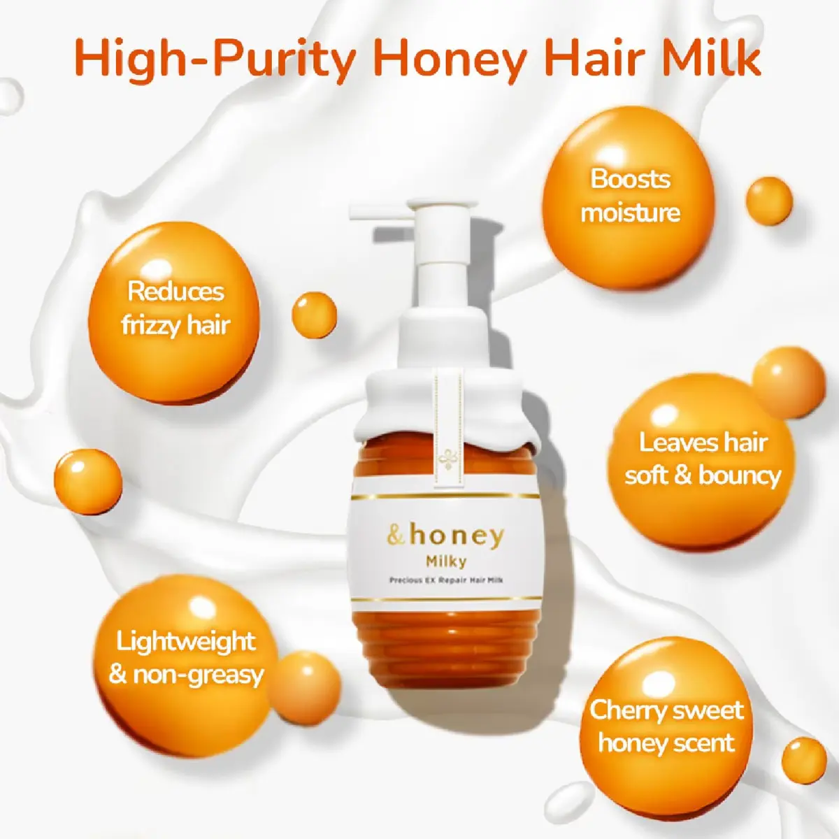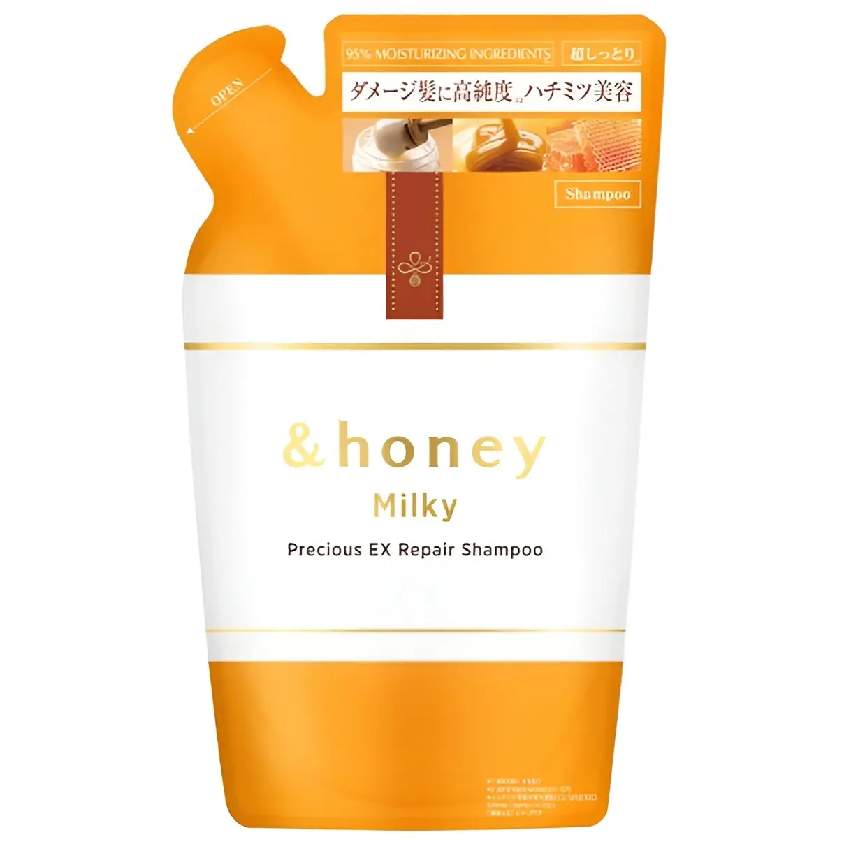 | Ingredients | Water,dimethicone,cetanol,behentrimonium chloride,stearyl alcohol,oleyl oleate,glycerin,honey,honey extract,hydrolyzed honey protein,argania spinosa kernel oil,hydrolyzed collagen PG-propyl methylsilanediol,keratin (wool),diisostearyl malate,polyquaternium-61,royal jelly,royal jelly extract,propolis extract,cerebroside,sodium carboxymethyl hyaluronate,zymomonas culture extract,zein,highbush blueberry seed oil,hippophae rhamnoides fruit oil,amodimethicone,xanthan gum,citric acid,ethylhexyl methoxycinnamate,diethylaminohydroxybenzoyl hexyl benzoate,coconut oil alkyl glucoside,caramel,aminopropyl dimethicone,DPG,isopropanol,ethanol,BG,phenoxyethanol,fragrance |
