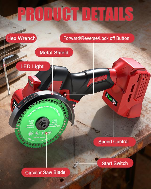 This cordless cutting tool supports 4-inch blades for more precise and efficient cutting. Powered by a brushless motor, it delivers higher torque, greater energy efficiency, stronger impact resistance, and longer lifespan than brushed motors, ensuring reliable and long-lasting performance.