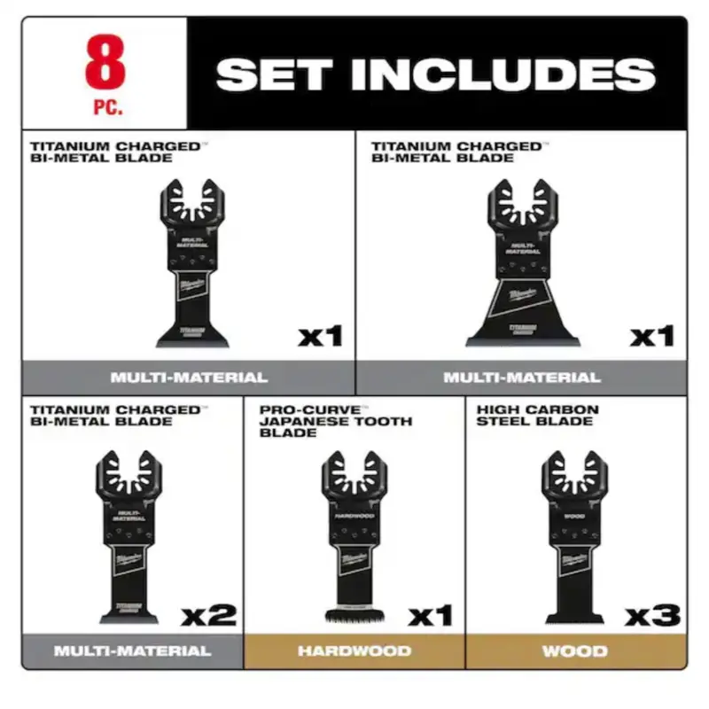 The Milwaukee Oscillating Multi-Tool Blade Kit includes 8 pieces, essential