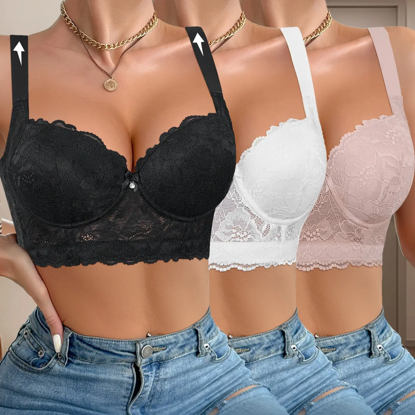 3PCS Women’s push up bra Set Lace Back Soft Comfortable Elegant Breathable Underwear Full Coverage minimizer bra, Longline Bustier Bra for Everyday Wear Shapewear Lingerie in Black White Pink Womenswear