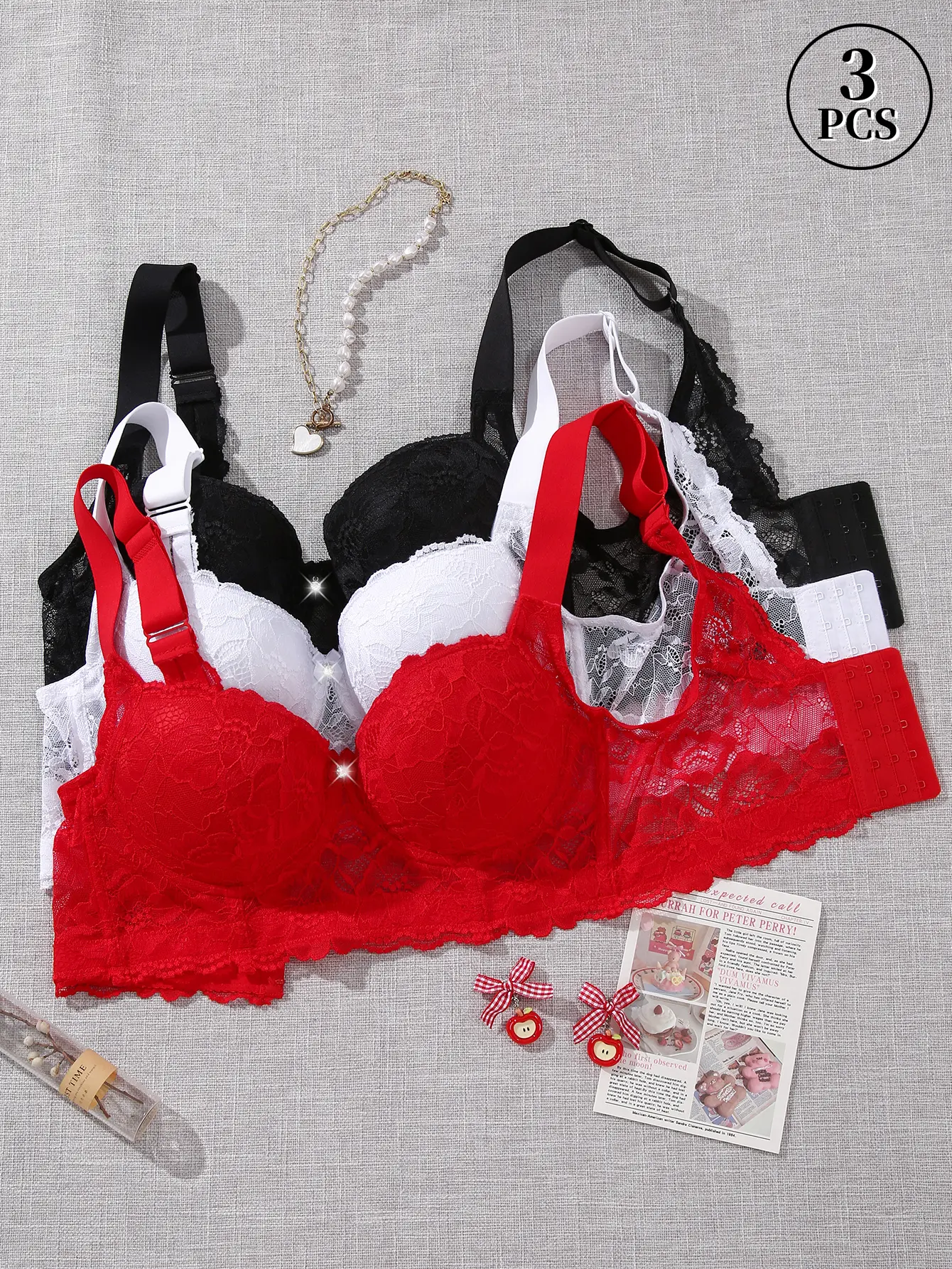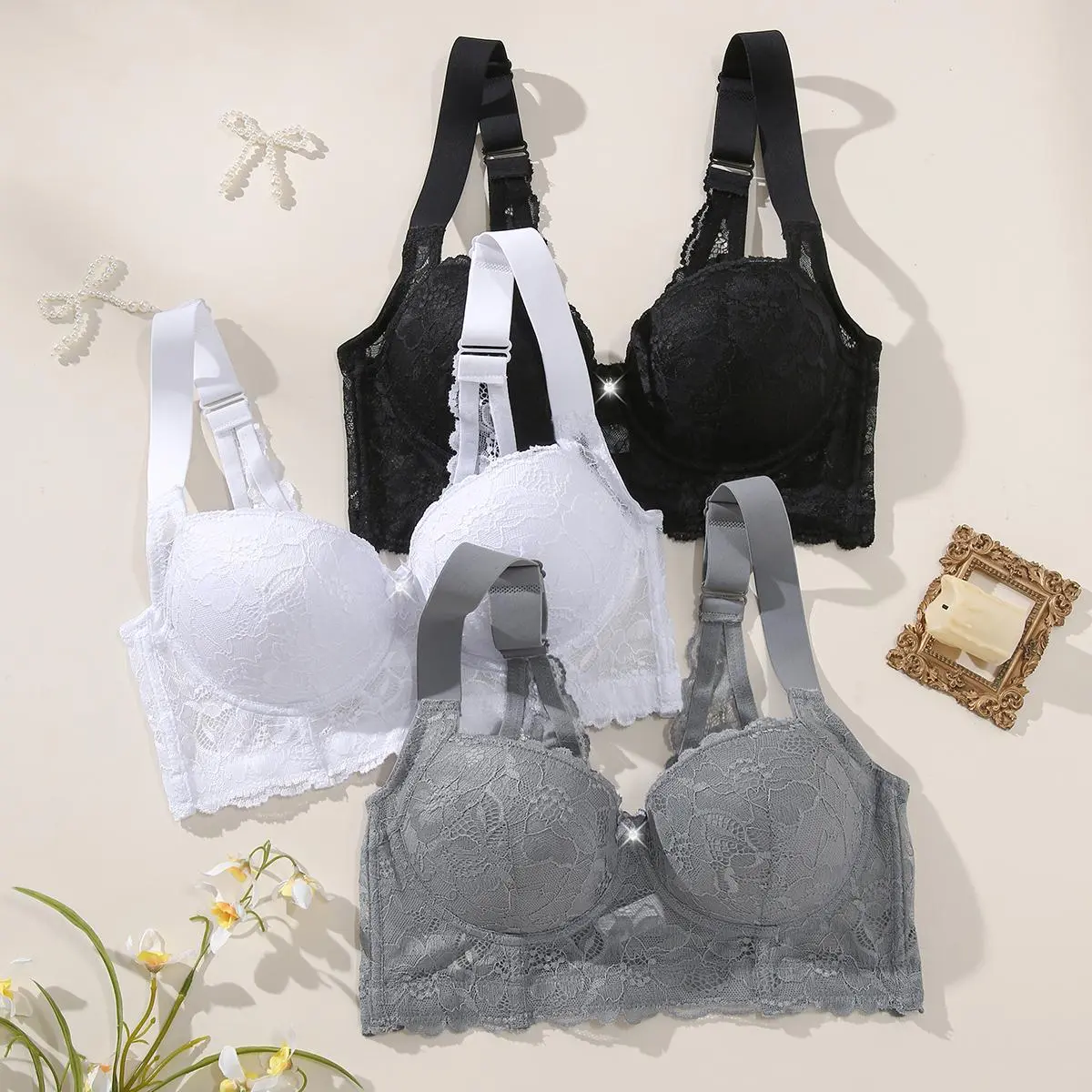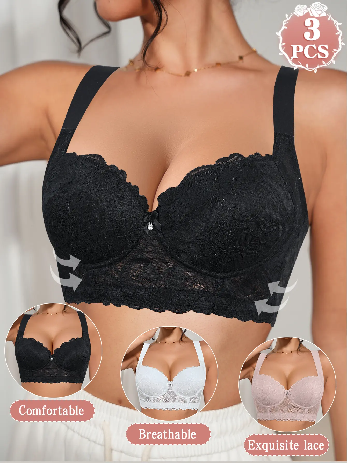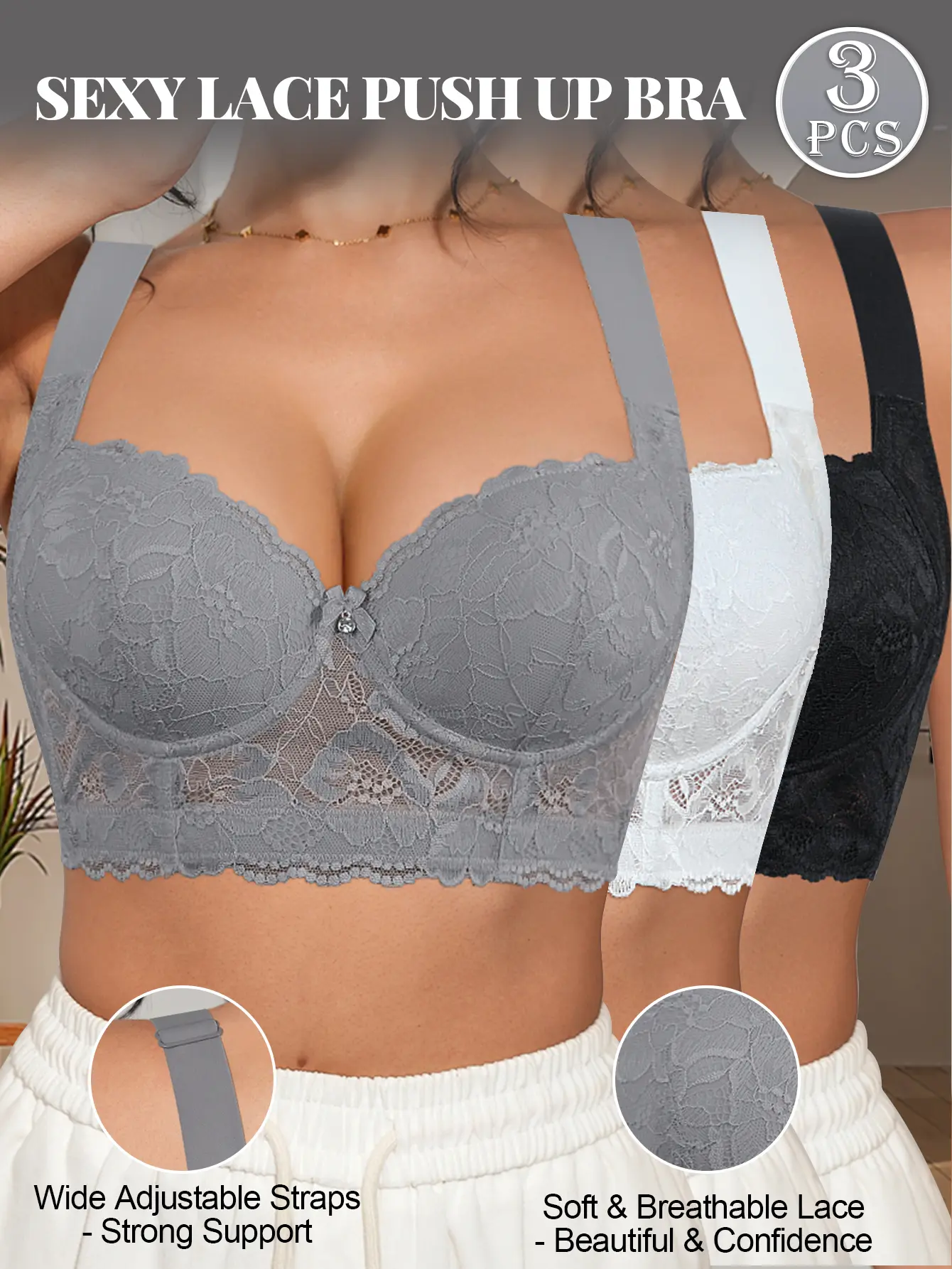 3PCS Lace Underwire Push-Up Bra - Anti-Sag, Wide Adjustable Straps, Comfort Breathable Elegance Elastic Lingerie, Versatile Wear Date Gift Bridal Everyday