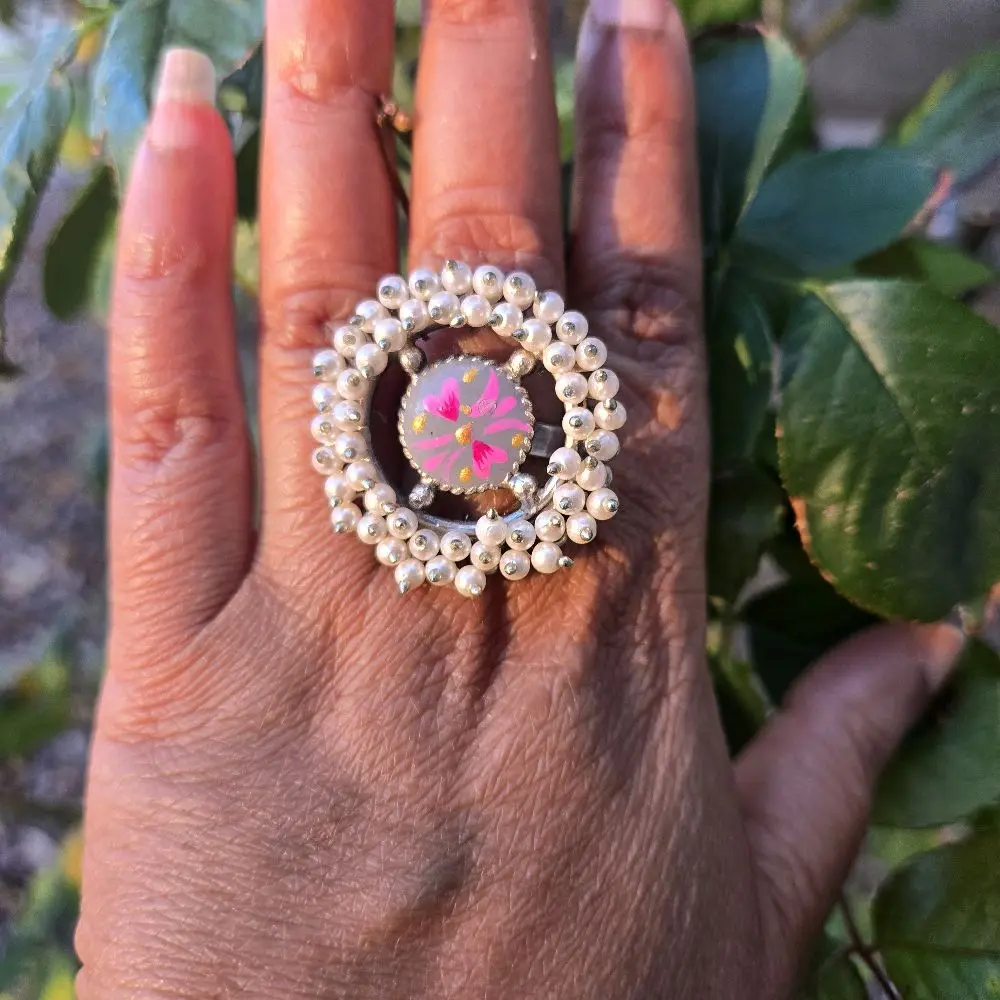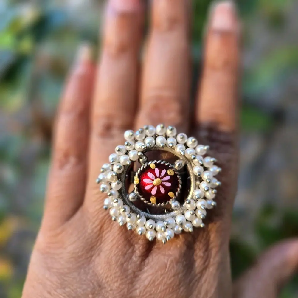 Minakari handmade Moti Ring with Unique Design and Beaded Surrounding Pattern