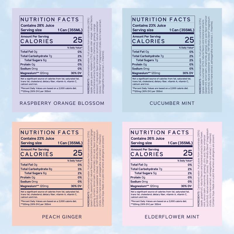 Each can contains 120mg of Magnesium Citrate, Ashwagandha, Lion’s Mane, and L-theanine. These ingredients help reduce stress, enhance focus, and promote relaxation*. 95% of TRIP customers report feeling calmer after their first sip*. Each can contains just 27 calories or less, supporting health and wellness. Enjoy guilt-free refreshment with no added sugars.