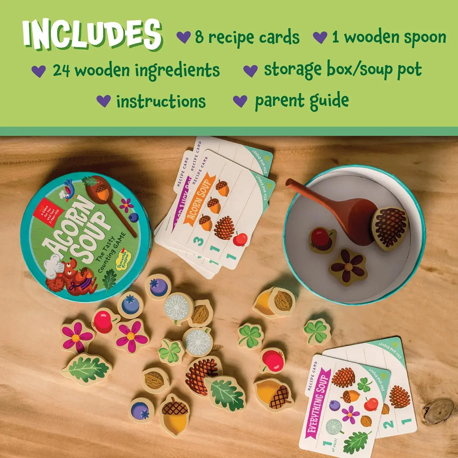 Making Acorn Soup is as easy as 1-2-3! The round box bottom doubles as a bowl, which contains wooden ingredients and a sturdy wooden spoon for mixing and stirring. Simple recipe cards teach toddlers to identify the ingredients and count as they cook. Mix, stir, eat and play together! This game is a part of a collection of games that encourage meaningful moments of connection between you and your 2-year-old..