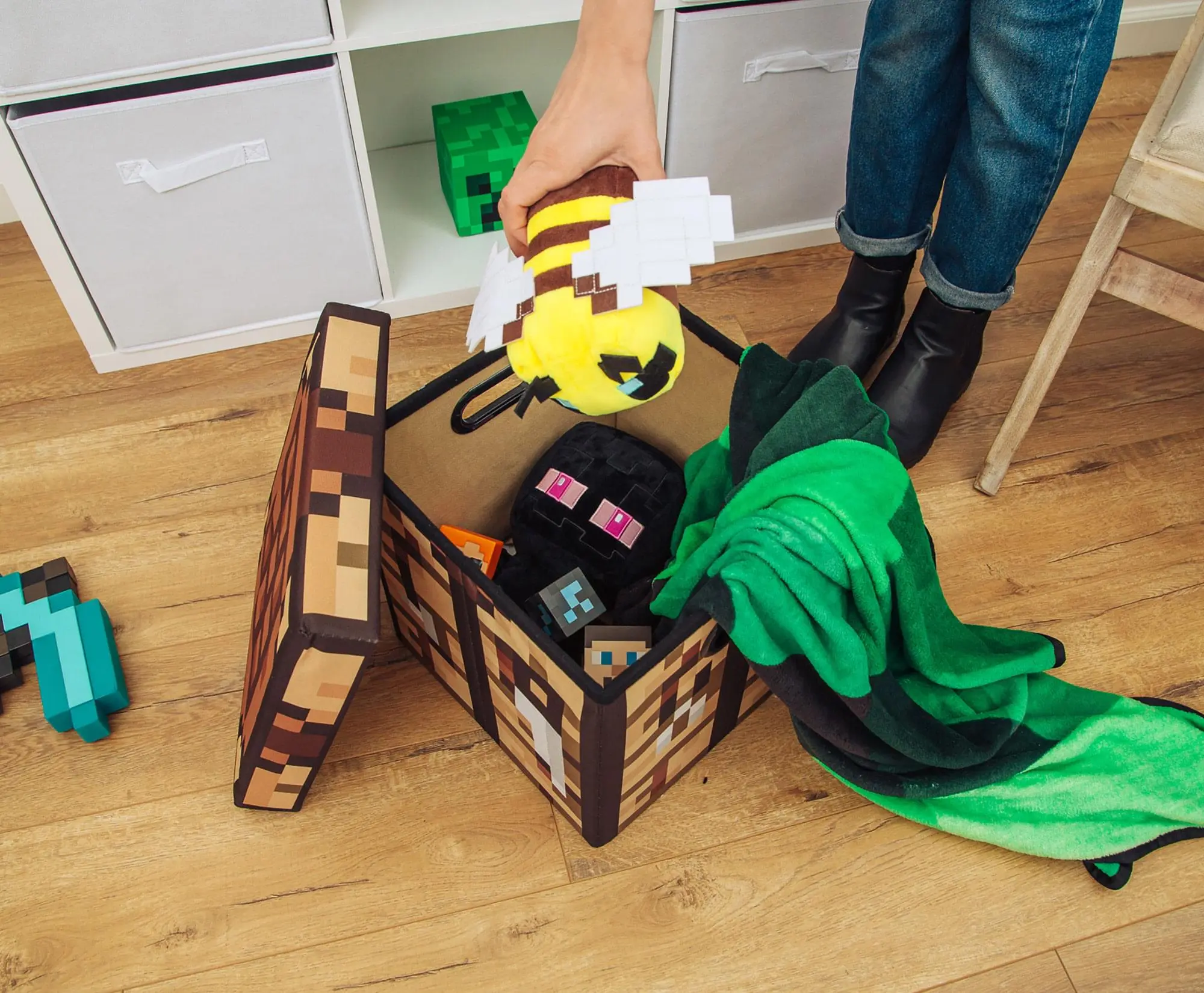 Let this Minecraft Crafting Table Storage Bin make organization fun. This 13" cube looks great and folds away when not in use, plus features handles that make it easy to relocate. Great for fans of all ages, this storage box fits right into a bedroom to store toys, a game room to organize collectibles, or an office to hide messy books and paperwork. It's also ideal for keeping all your redstone ore and crafting supplies out of sight.