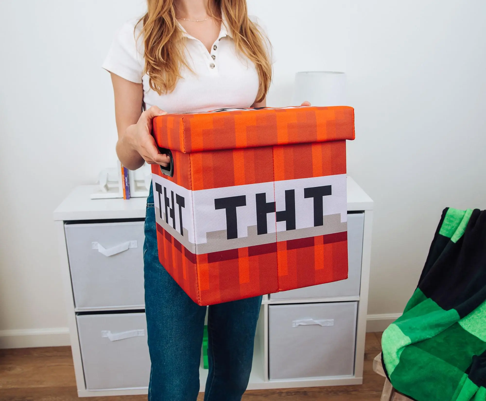 No one will mess with your stuff in this Minecraft TNT Block Storage Bin, which makes organization a real blast. This 13" cube is perfect for storing your gaming gear out of sight and taking your setup to the next level. Keep it in a kid's bedroom, dorm room, or your office. With the handles, it's easy to carry and relocate, but the real beauty is that when you don't need it, the box folds down flat. Organization. Boom.