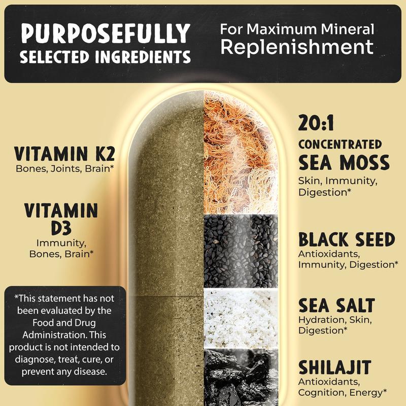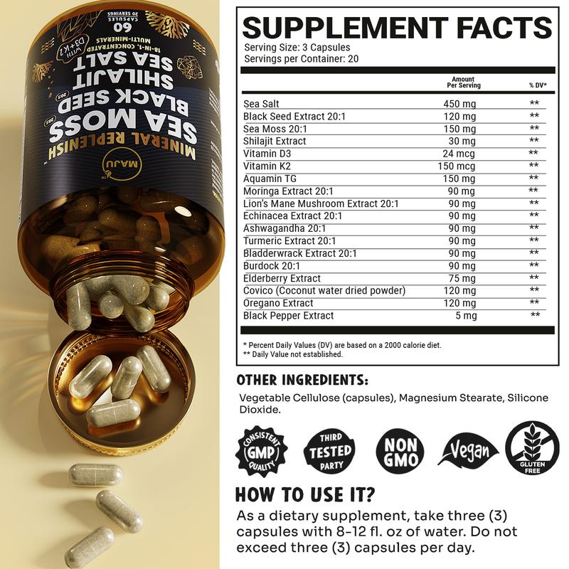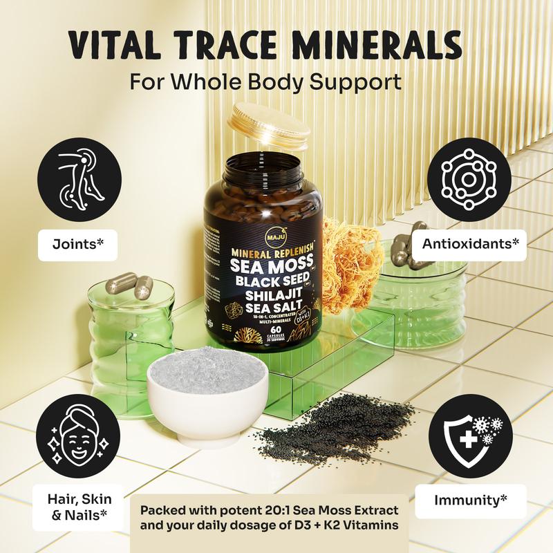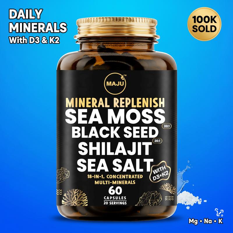 ·Maju’s 18-in-1 Mineral Replenish is a potent multi-mineral supplement that combines eighteen different concentrated extracts harvested from both land and sea. Namely, Sea Salt, Black Seed, Sea Moss, Shilajit and Vitamins D3 K2. Just 3 capsules per day delivers over 1800mg of trace minerals, vitamins and nutrients.