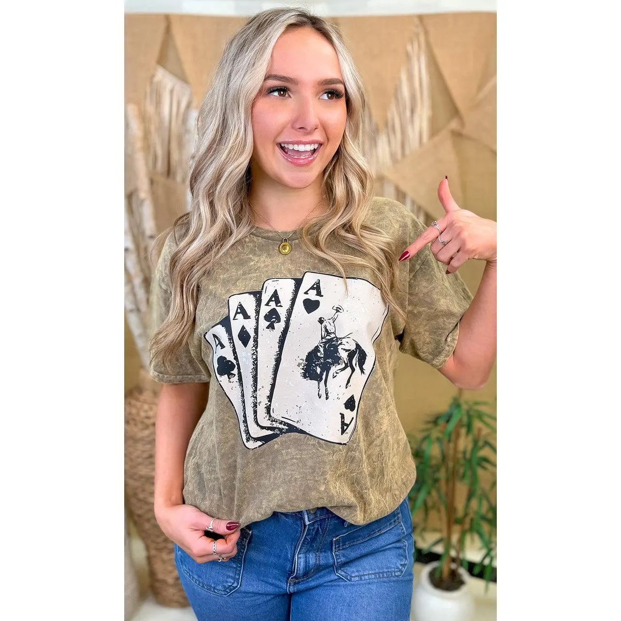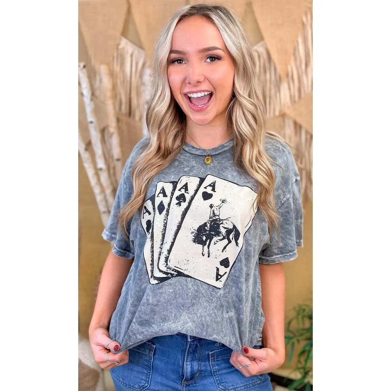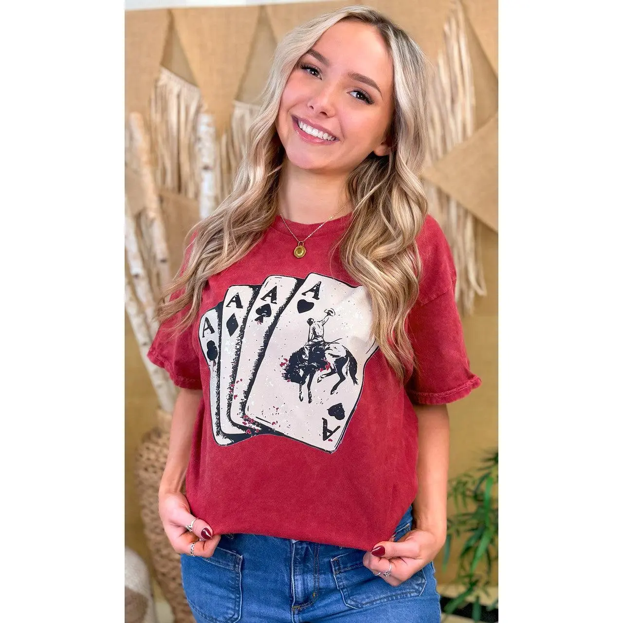 ·This graphic t-shirt's design features four poker cards, all aces of each of the four suits, the top of which shows the image of a rodeo-riding cowboy. This top is perfect for everyday wear!