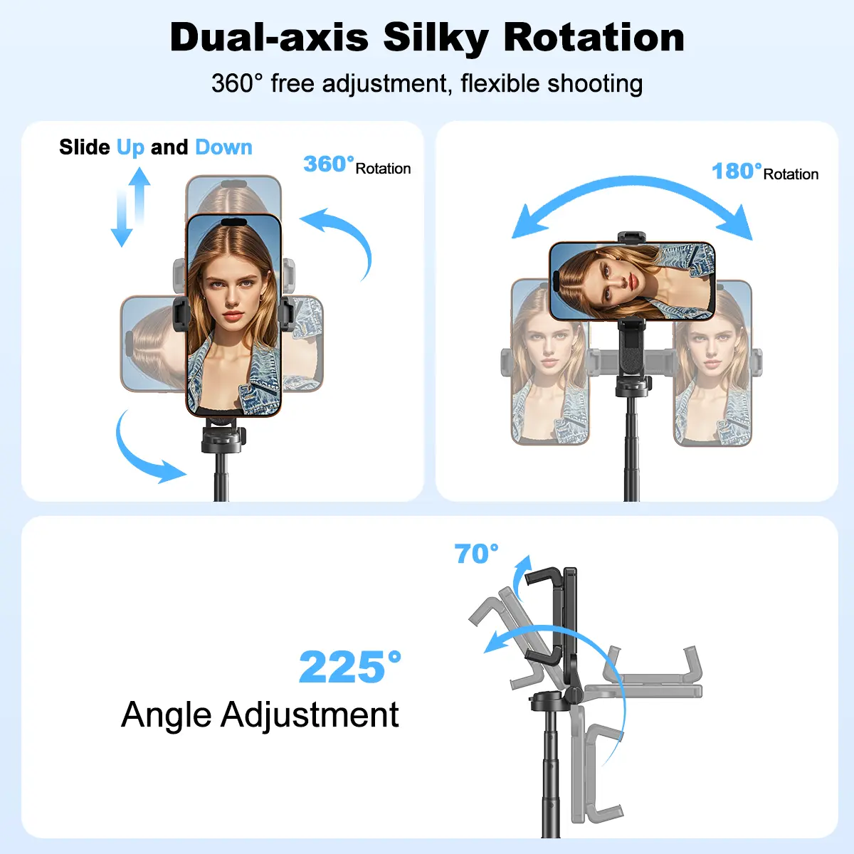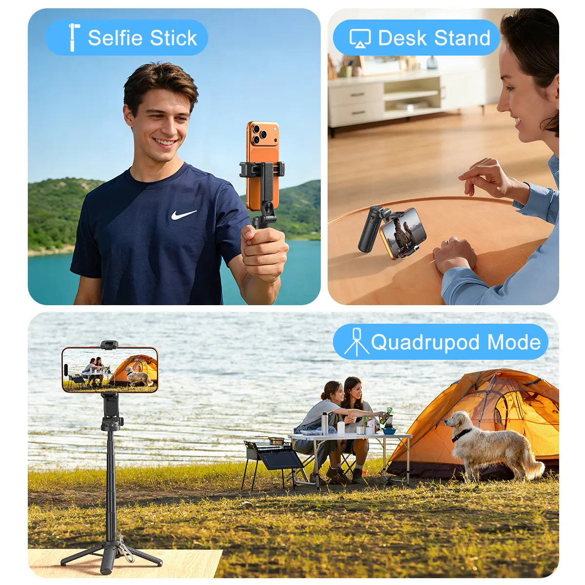I love this multifunction selfie stick. It has a small control so you can take pictures from afar, just pair it with Bluetooth. The selfie stick gets longer as well, & I like the fact that it rotates so you can put your phone upwards or sideways. Light weight. Overall very happy with my purchase