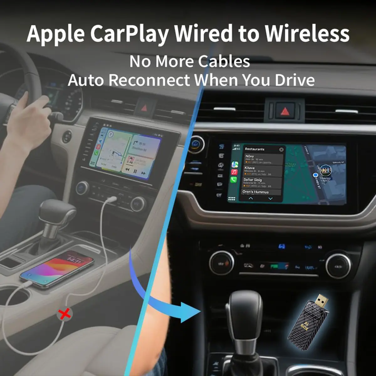 Wireless CarPlay AI Box - This wireless CarPlay adapter has three modes: wired to wireless CarPlay, wireless Android Auto, wired Android Auto, this magic box adds more fun to your journey. Please note that this wireless carplay and android car adapter has a type-c adapter, it is only suitable for wired CarPlay, USB plug and play.