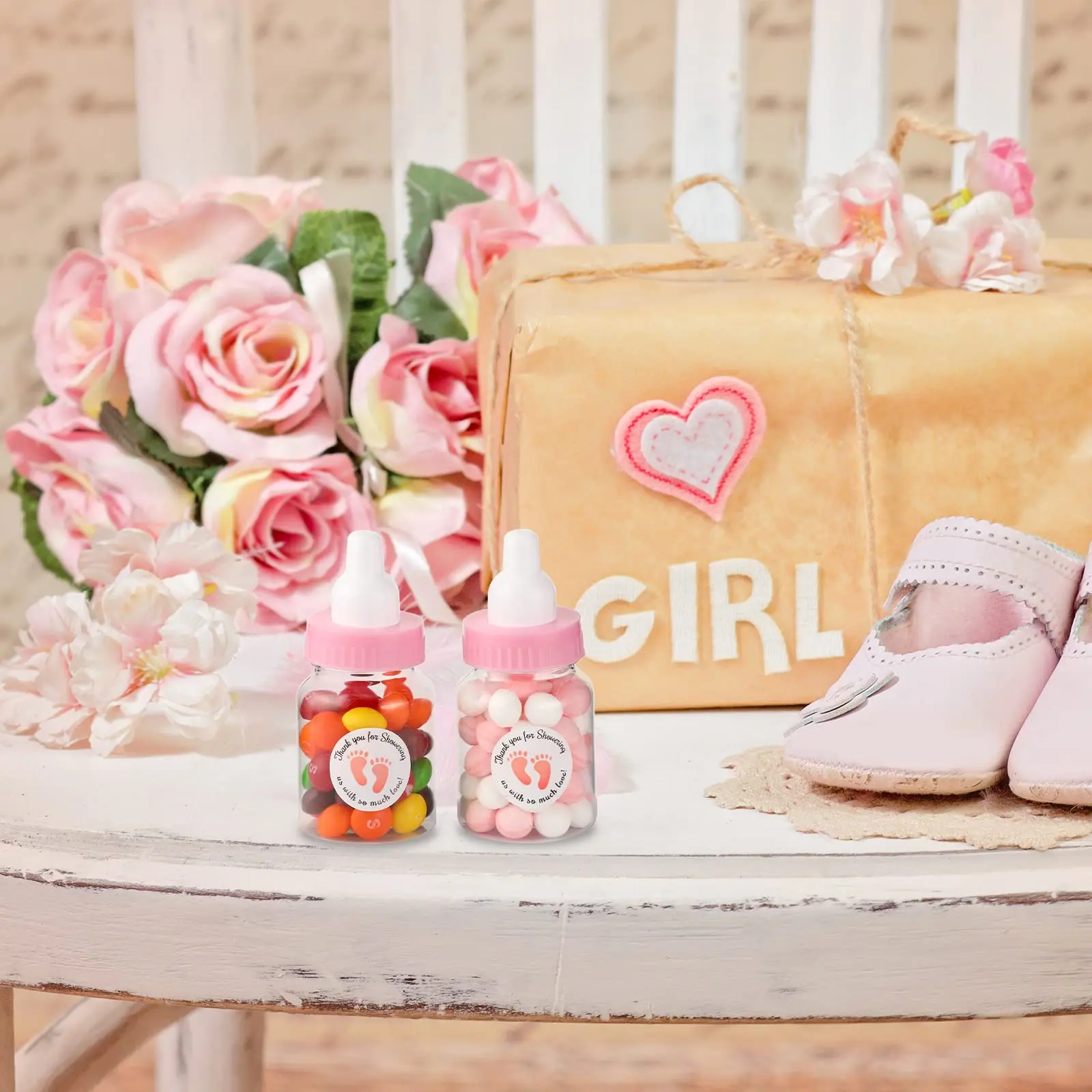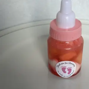 The pink baby bottles for baby shower game can be applied to store small toys, candy, chocolate, marshmallows, or other small items, and paired with lovely stickers, suitable as a baby shower gift and let guests take home.