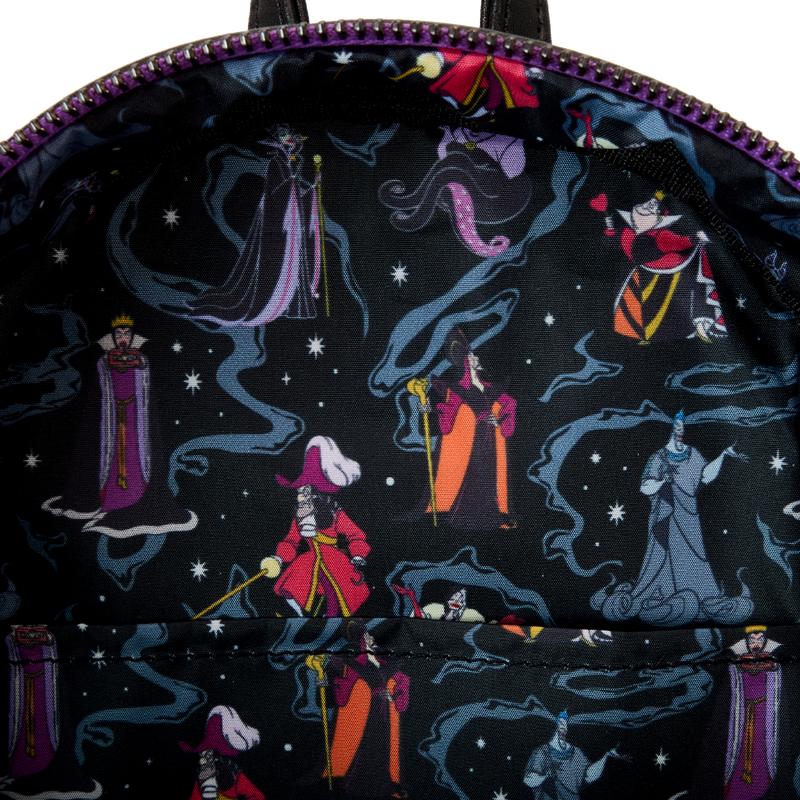Gleam while you scheme. Wreak fashionable havoc with our Disney Villains iridescent mini backpack. The iridescent material covering this backpack carries a motif featuring some of Disney’s most famous villains, including the Queen of Hearts, Cruella de Vil, Maleficent, the Evil Queen, Hades, Jafar, Captain Hook, and Ursula. Pack your daily essentials and take off on all the fun adventures your dark heart desires.Features:Vegan leather (polyurethane)Adjustable shoulder strapsSturdy top handleSide panelsZippered main compartmentZippered front compartmentGunmetal-colored hardwareApplique, iridescent, and printed detailsCoordinating inside liningDimensions:   9”W x 10.5”H x 4.5”D