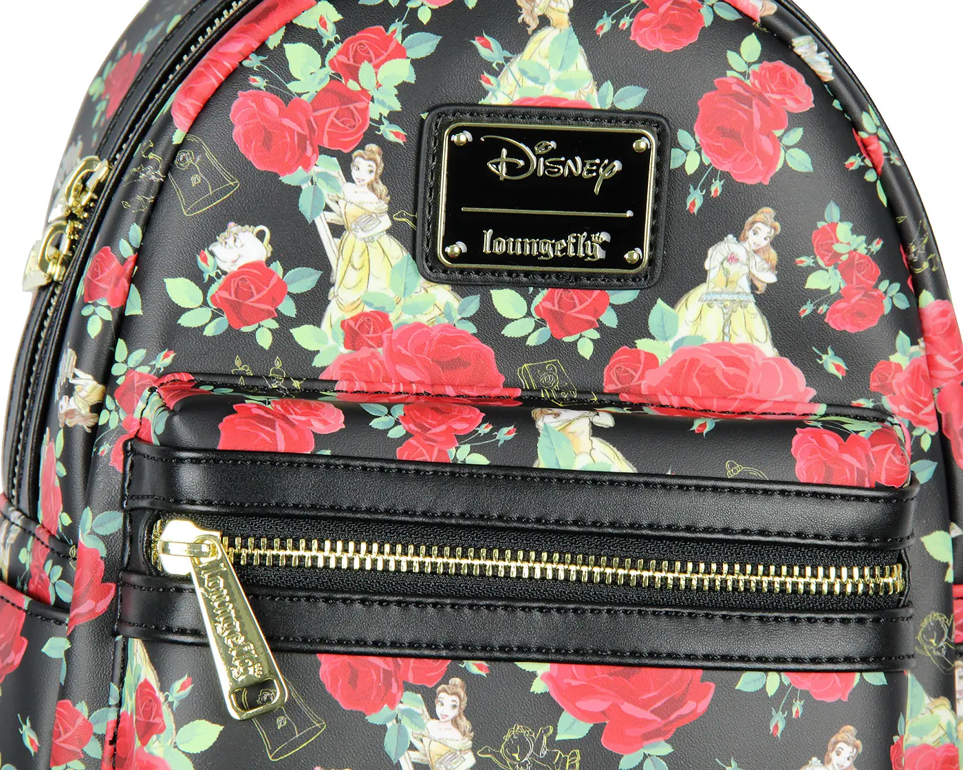 Loungefly is known for their high quality handbags, backpacks, and wallets. This mini backpack features an all-over print of Disney's Belle from Beauty and the Beast with roses, books, Chip, Cogsworth, Lumiere, and Mrs. Potts. Made with a PU leather base, front Disney plaque, dual reinforced padded shoulder straps, top handle, front exterior zipped pocket, two side exterior pockets, fully lined interior, and top zip closure. this backpack measures 10.5" x 9" x 4.5" inches GREAT Disney Product by Loungefly 10.5" x 9" x 4.5" Padded Adjustable Shoulder Straps Front Exterior Pocket & 2 Side Pockets Perfect gift for Birthday, Christmas, Valentine's Day, Mother's Day, Anniversary, or other important holidays.