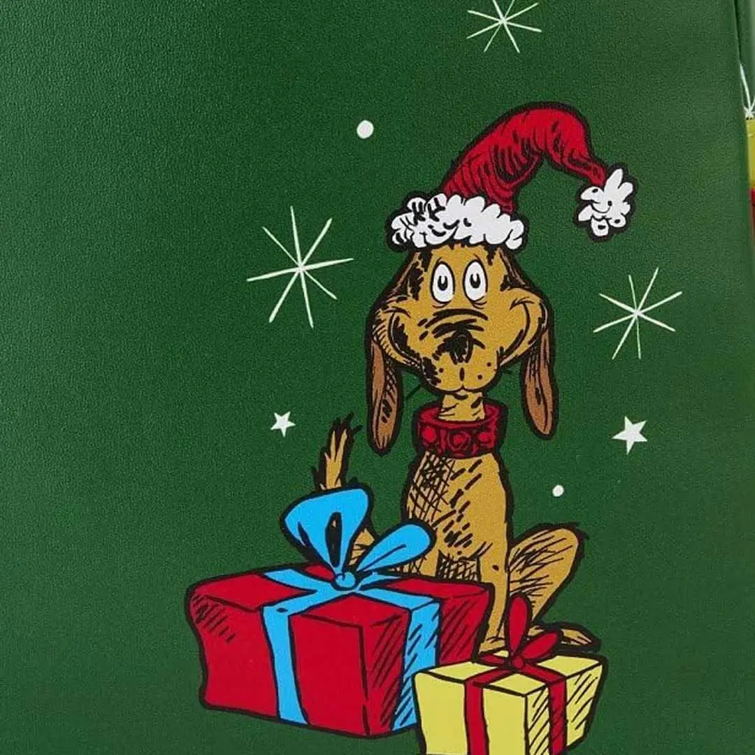 The Grinch? Max? Presents? Wrap it all together to get the perfect Whobilation gift with the Loungefly Dr Seuss Grinch Santa Cosplay Mini Backpack! This faux leather Loungefly mini backpack features The Grinch in his Santa outfit with a devilish grin on his face. Stealing another present - that's no surprise, but what's this? Max pops up and down from the gift box! It's a gift from Max after all! On the back, Max makes an encore appearance with an adorable Santa hat and is surrounded by Christmas presents. This bag will definitely grow your heart three sizes bigger!
