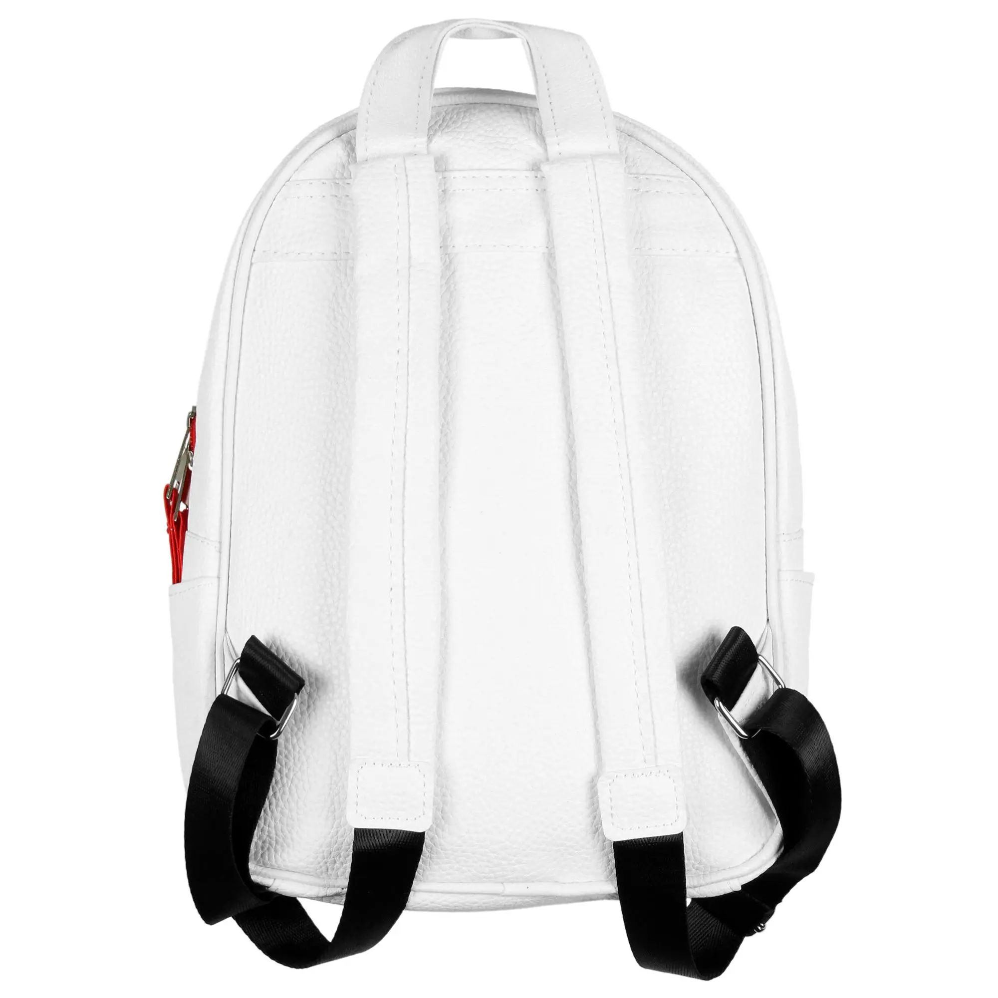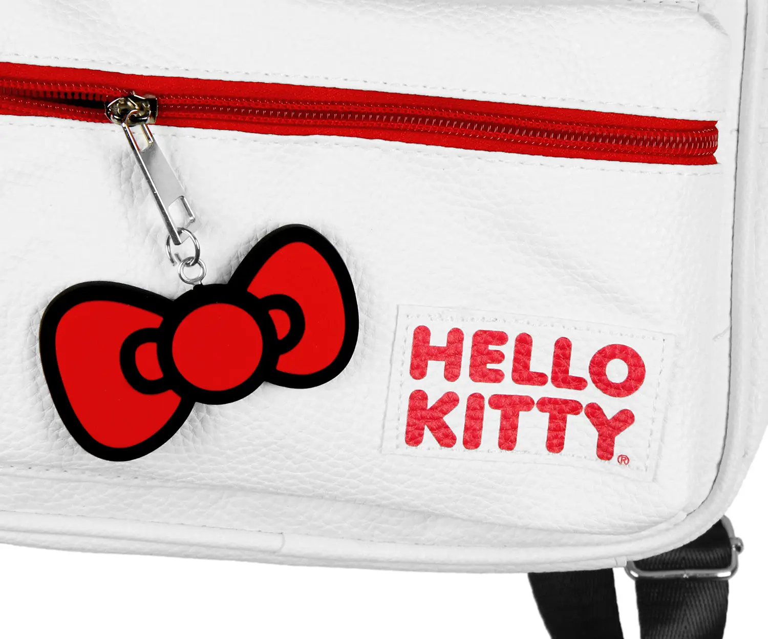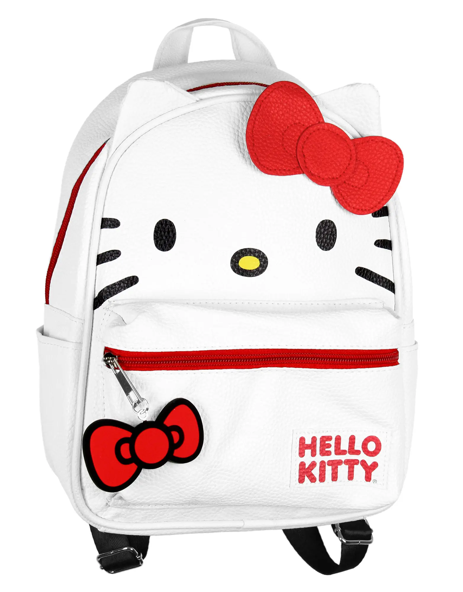 Hello Kitty is not like other cats. She can't waste her day taking naps and sunbathing, she wants to spend her time hanging with friends and learning new things. That's exactly why this Hello Kitty character backpack is great as a companion on all of your adventures. This white faux leather backpack features a Hello Kitty face with whiskers and a 3D amazing bow. There is a main compartment to carry all of the essentials, as well as a front zipper pocket with a red rubber bow charm. There is also two side pockets and adjustable padded straps. This backpack is great for and Hello Kitty fan. This backpack measures 11" x 8.5" x 4.5" inches HELLO KITTY MERCHANDISE - This Hello Kitty Backpack is a guaranteed product DETAILED ALLOVER PATTERN - This backpack features a large face design of the beloved kitty with 3D ears and a bow on a textured white faux leather material FEATURES - There is a main compartment to carry all of the essentials, as well as a front zipper pocket with a red rubber bow charm. There are also two side pockets and adjustable padded straps. This backpack is great for and Hello Kitty fan. MEASUREMENTS - 11" x 8.5" x 4.5" This is a wonderful backpack for Sanrio fans, casual outings, theme parks, or gifting to Hello Kitty lovers