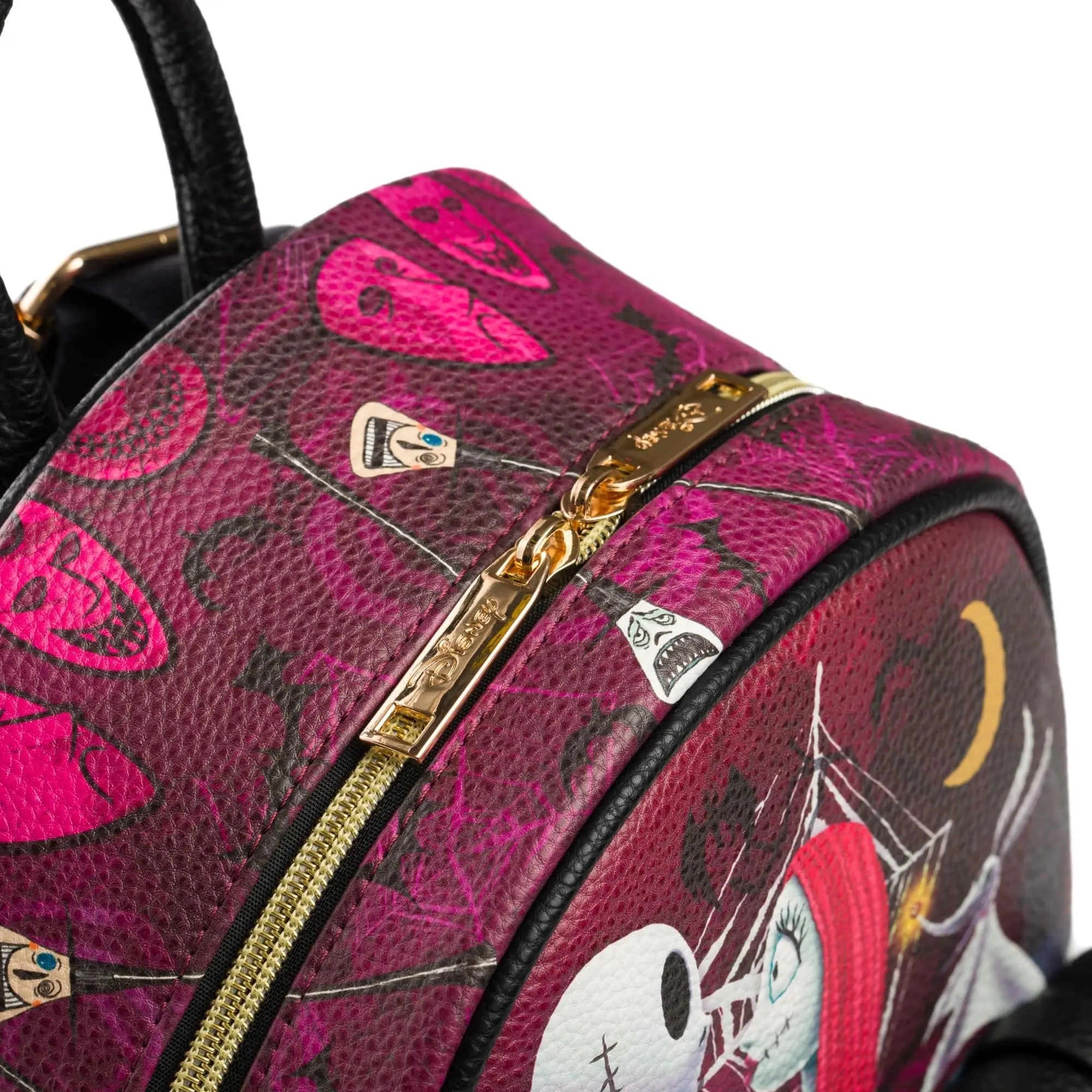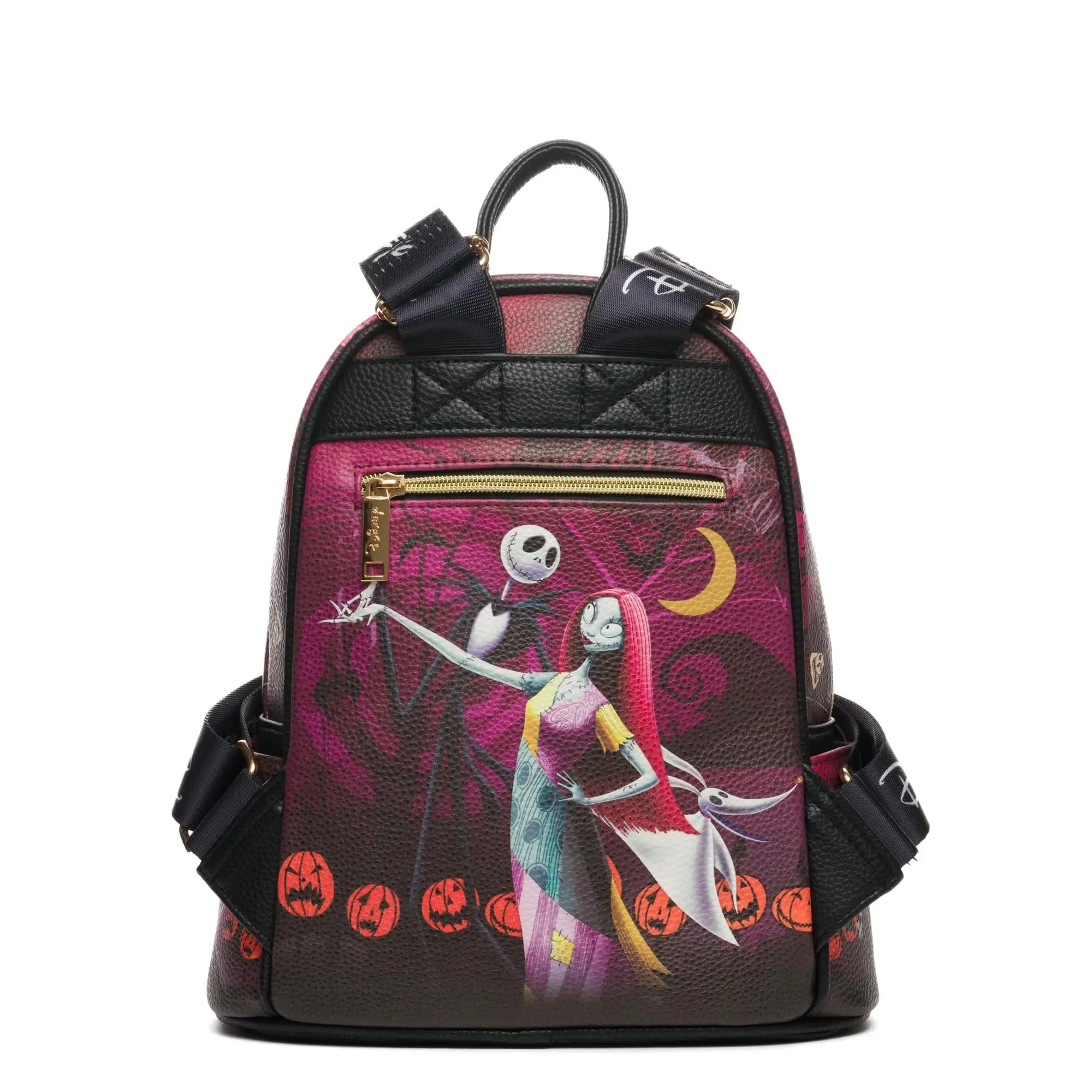 The WondaPop Disney Nightmare Before Christmas Jack and Sally 11" Mini Backpack is a striking tribute to Tim Burton's iconic film, capturing the gothic romance of Jack and Sally in a haunting moonlit scene. Made from high-quality vegan leather, the bag features a dreamy blue tone that sets the perfect backdrop for the spooky yet sweet imagery on the front and sides. With Lock, Shock, and Barrel on the front pocket and Oogie Boogie and Zero on the sides, this mini backpack is full of eerie charm and detail that fans will love.