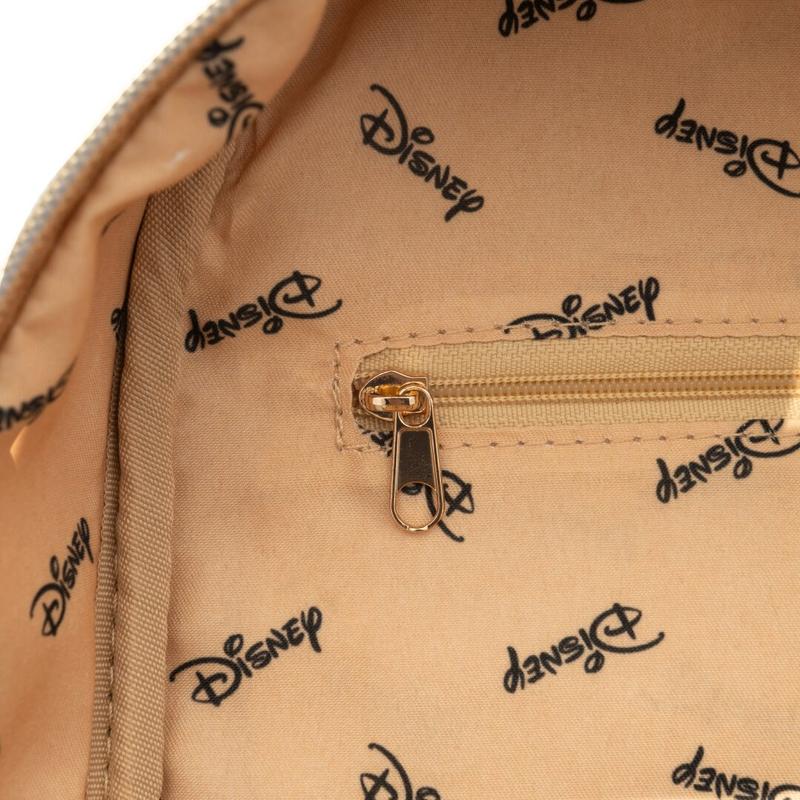 Designed for both fashion and functionality, this backpack is made from high-quality vegan leather, ensuring durability and a luxurious feel. The interior is lined with a beige fabric adorned with the Disney logo, and includes a convenient zipper pocket for secure storage. The adjustable straps feature the Disney logo and provide a comfortable fit for all-day wear.