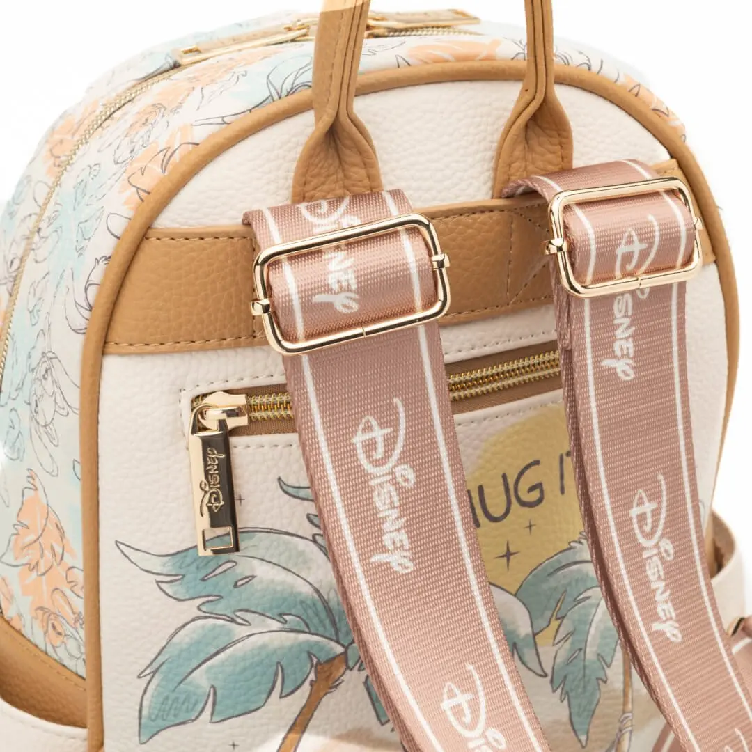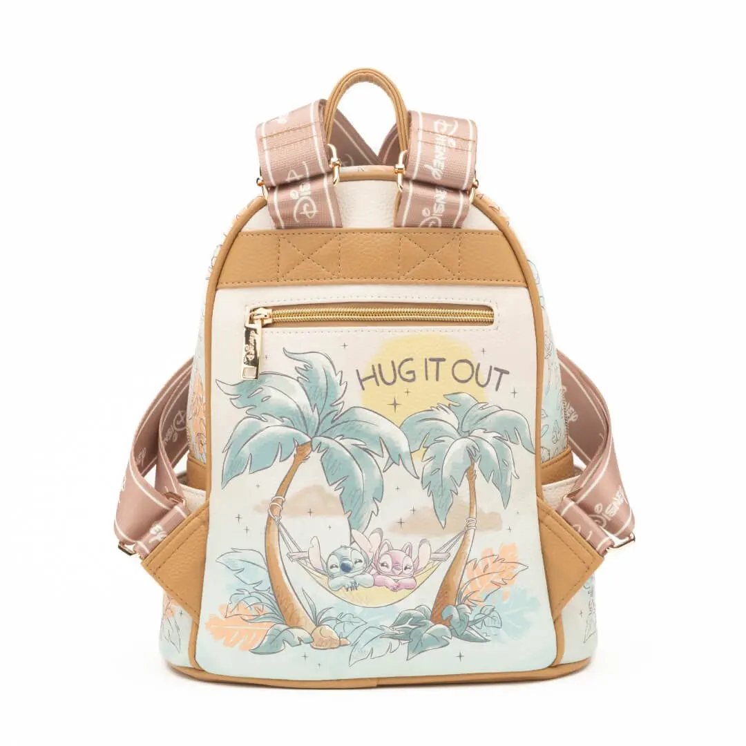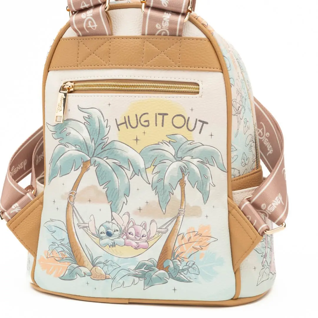 Celebrate your love for Disney with the WondaPop Disney Stitch & Angel Hug It Out Mini Backpack, a 707 Street exclusive! This beautifully crafted Lilo & Stitch mini backpack showcases Stitch and Angel sharing adorable moments in a hammock under palm trees, with the phrase "Hug It Out" set against a backdrop of soft pastel colors. The front pocket adds an extra layer of cuteness with Stitch and Angel nestled together with the words "We're better together."