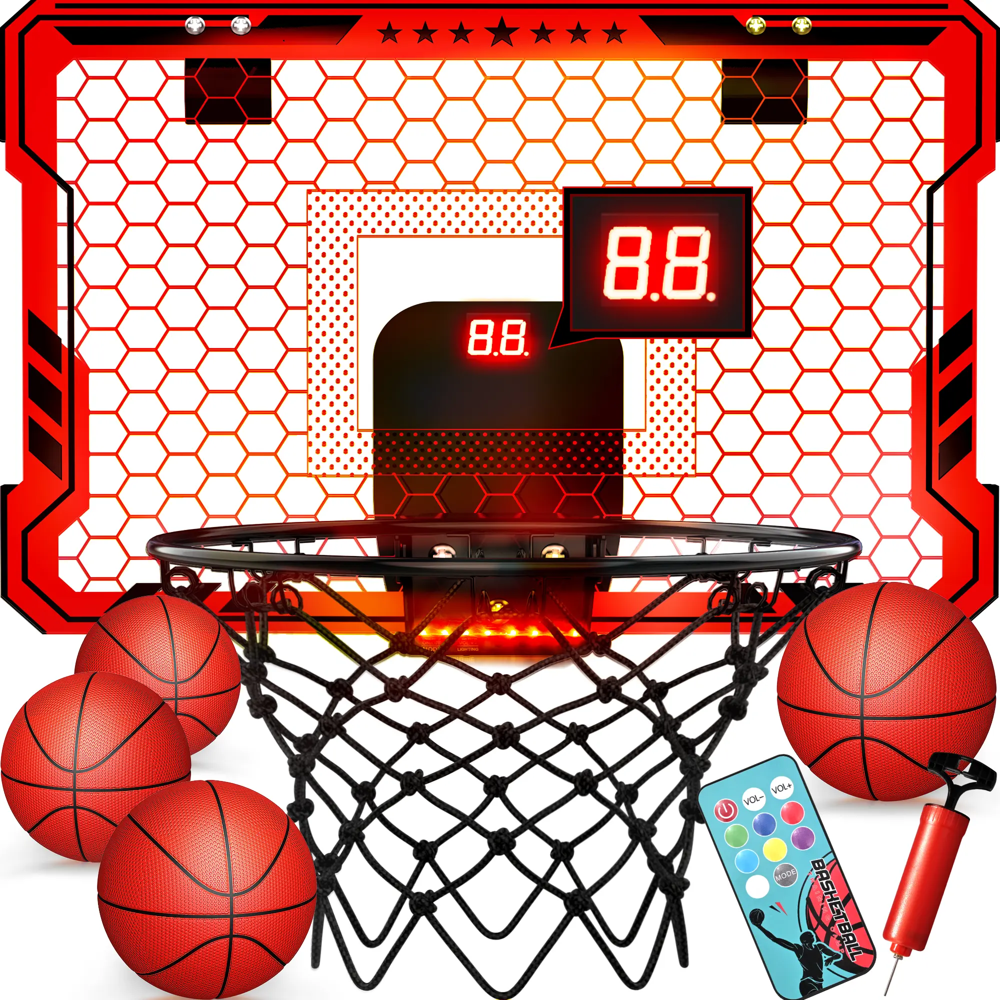 ·REMOTE CONTROL SCOREBOARD: Newly upgraded scoring kids basketball hoop, remote switch 7-color LED lights and modes. Accurate electronic scoring, cheering for each goal, adjustable volume. Indoor basketball hoop include 4 high quality rubber balls, shooting non-stop, happy non-stop