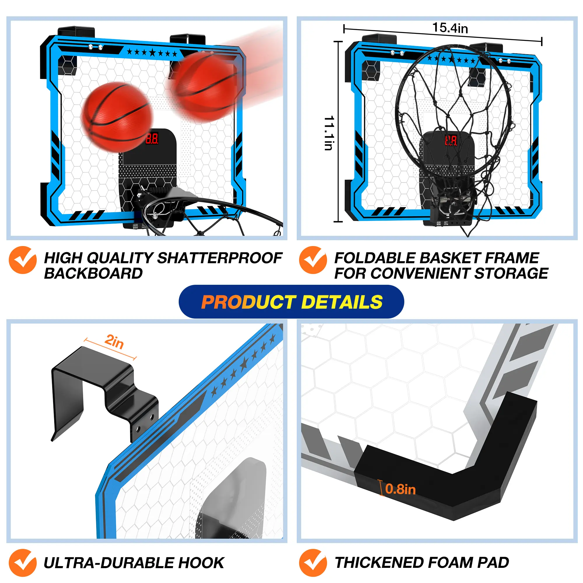 ·EASY INSTALLATION & STORAGE: The installation steps of the mini basketball hoop are simple and clear, detailed instructions are provided. Our indoor basketball hoop is suitable for many scenarios and has good adaptability. The mini hoop basket can be rotated down to a maximum of 60 degrees and can also be folded up for storage