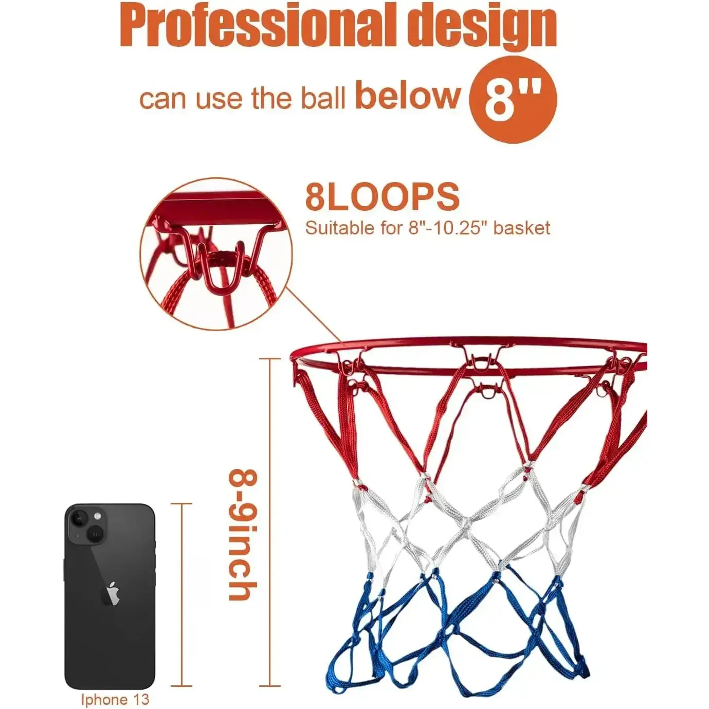 [APPLICATION]The 8 loop basketball net replacement is 12 inches length; After installation, the vertical length is 8 to 9 inches; Fits the hoop which is 8"-10.25" in diameter and 8 hooks.(Kindly Note: 2* mini hoop net replacement only, and ball shall be smaller than 8")