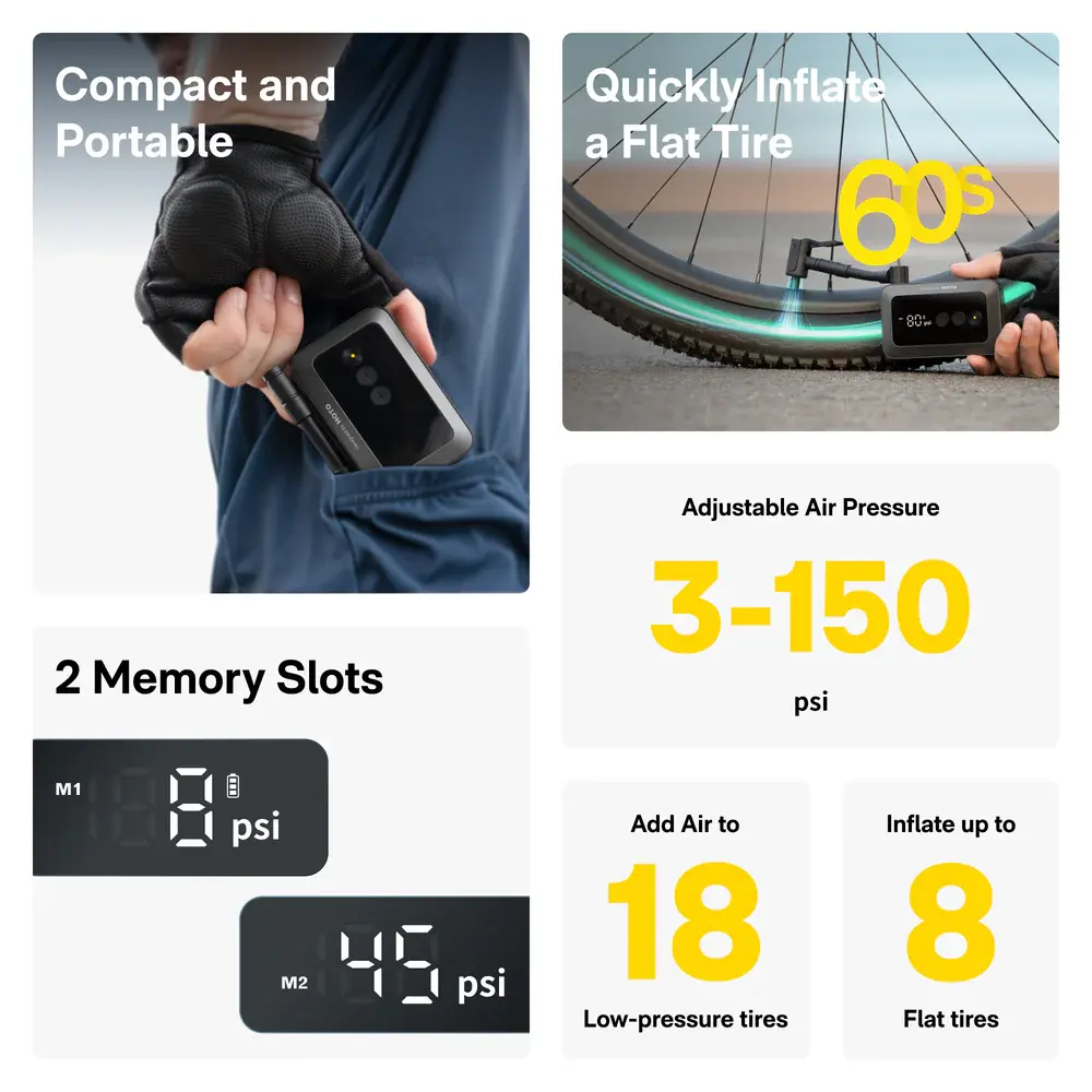 Ā·Pocket-Sized Powerhouse: Inflate up to 150 PSI, filling a 700x23C tire (55-80 PSI) in just 25 seconds.