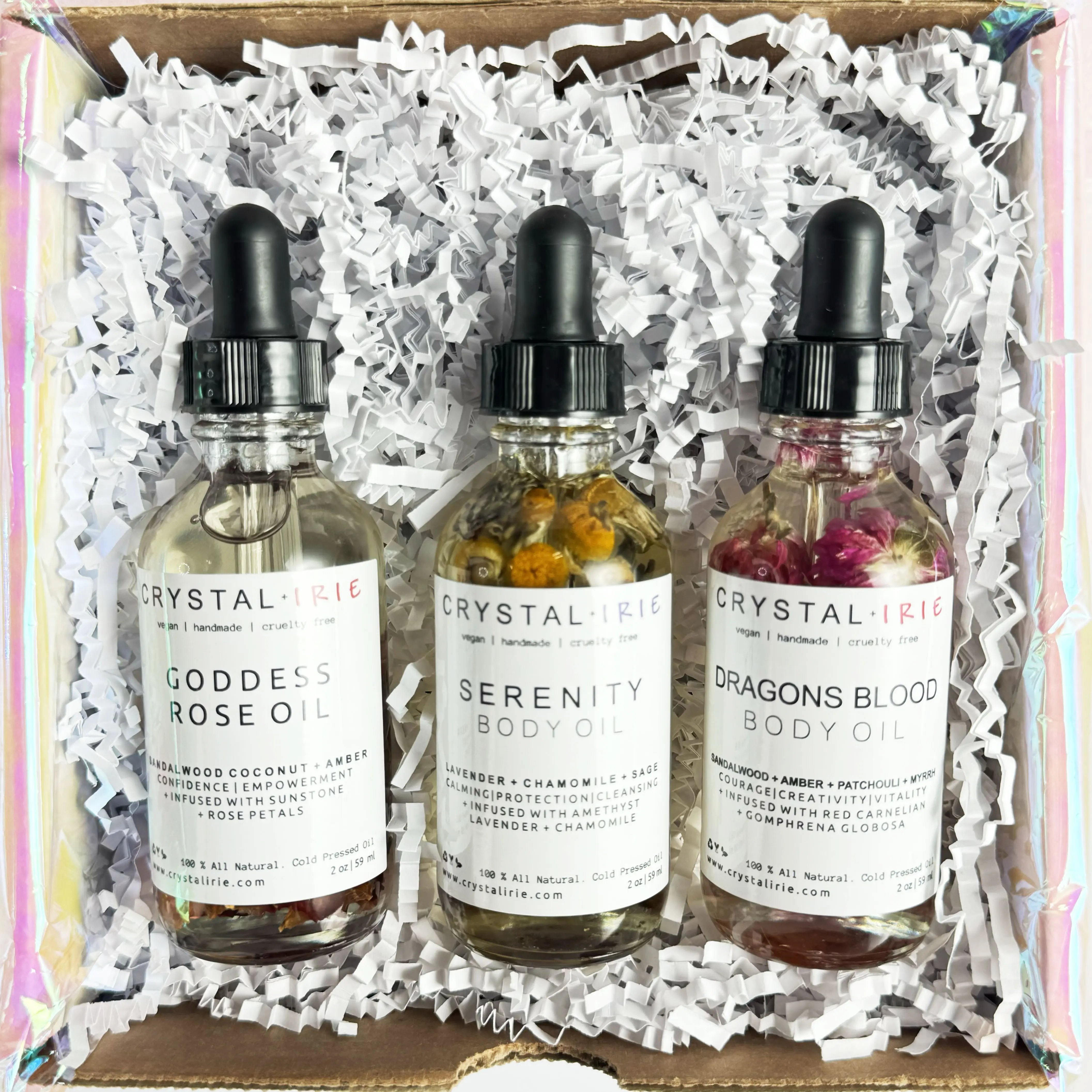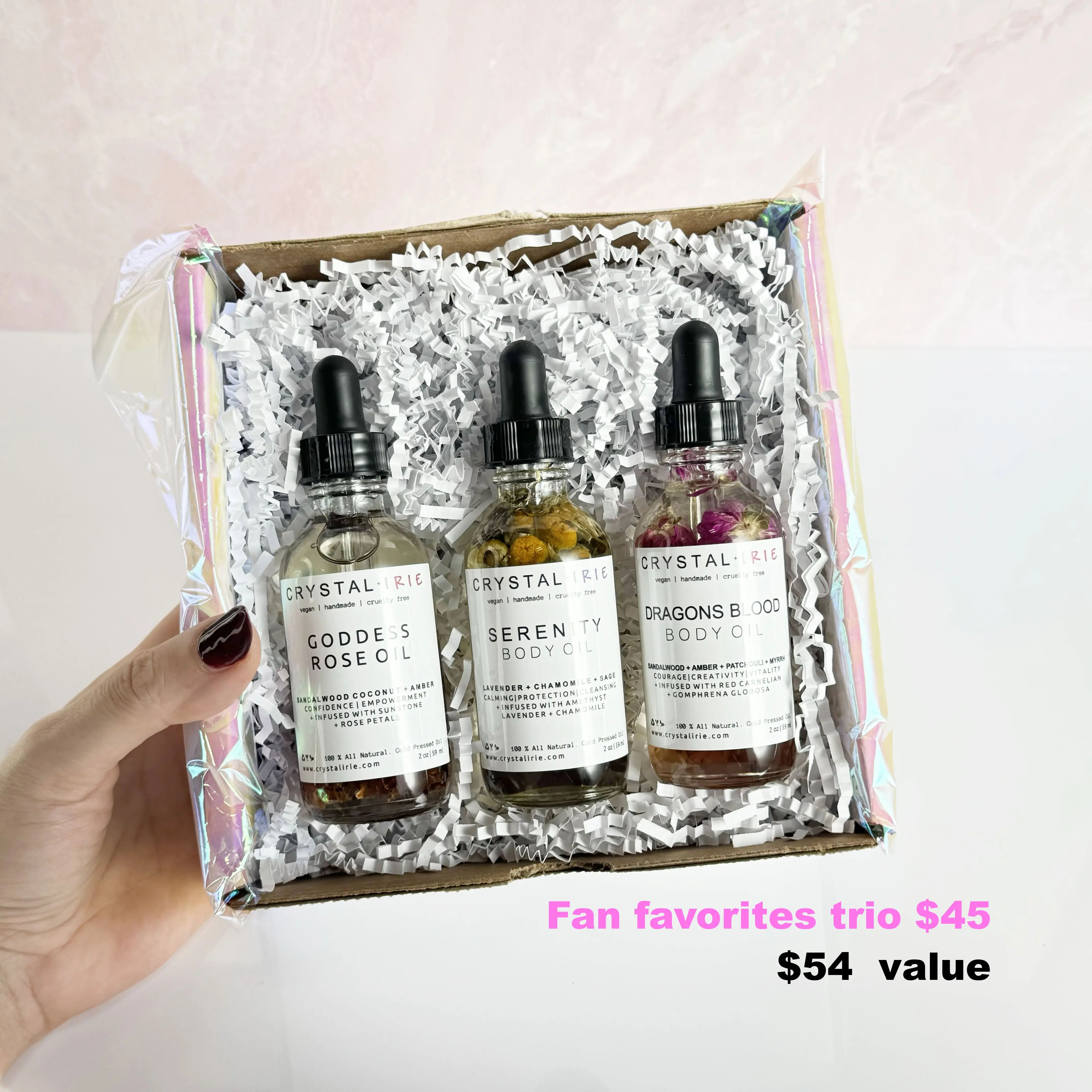 Our top selling fan favorites mini Body oils set including our best sellers Goddess Rose Oil, Serenity and Dragons Blood Oil.