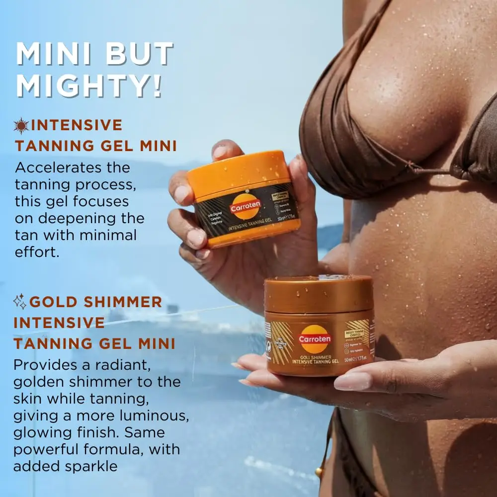 ·Instant Sun-Kissed Glow: Achieve a flawless, even tan instantly with the original Carroten Intensive Tanning Gel. For an added radiance, choose the Gold Shimmer Tanning Gel, the same powerful formula, enhanced with bronzing shimmering pearls for a subtle sparkle.