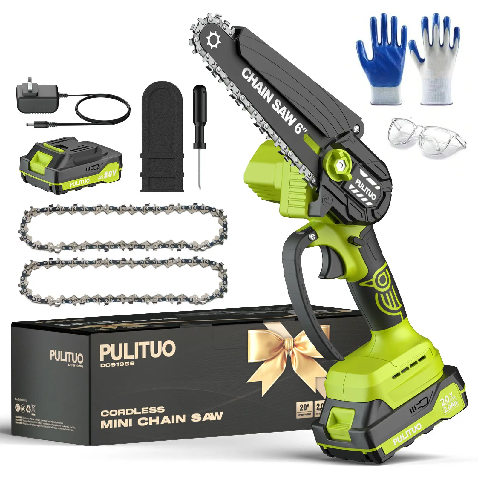 The PULITUO 6 Inch Electric Chainsaw Cordless is a lightweight, handheld tool perfect for tree branches, wood cutting, and pruning. It comes with a battery, charger, 2 chains (one assembled, one replacement), a plastic bar cover, a screwdriver, and a non-woven bag. The 20V charger ensures efficient power for your mini saw.