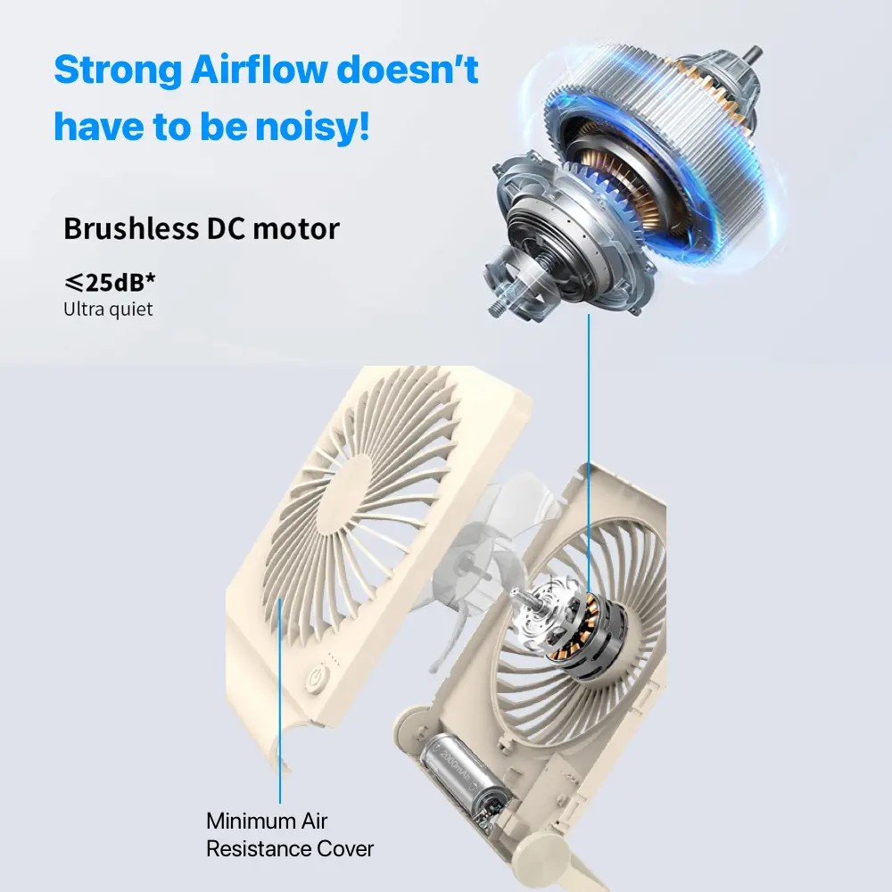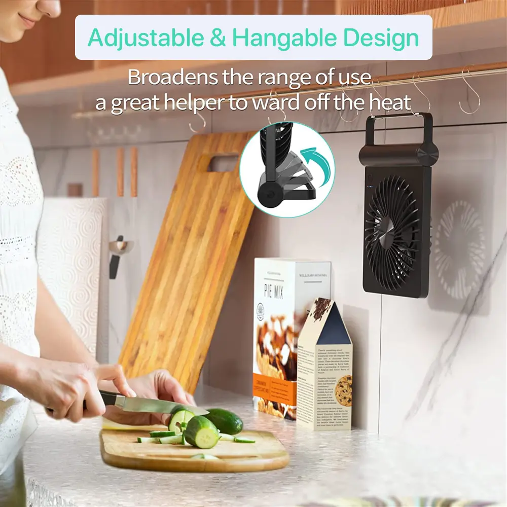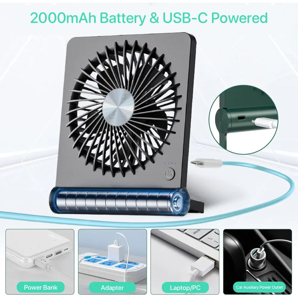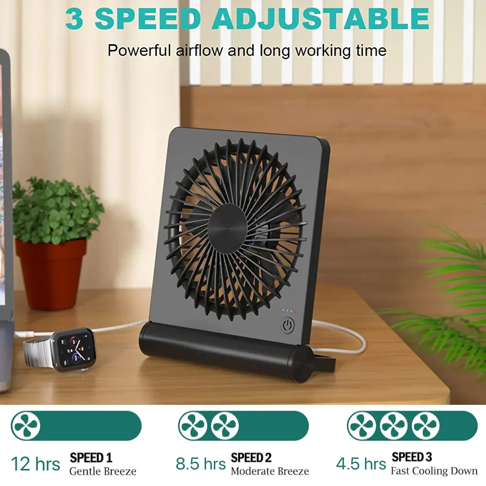Enjoy the flexibility of a dual power system – battery and USB! This rechargeable fan features an upgraded 2000mAh battery, offering long working times. Perfect for camping, traveling, and office use. Choose between Speed 1 (12 hours), Speed 2 (8.5 hours), and Speed 3 (4.5 hours). Plug it into a power supply for continuous operation.