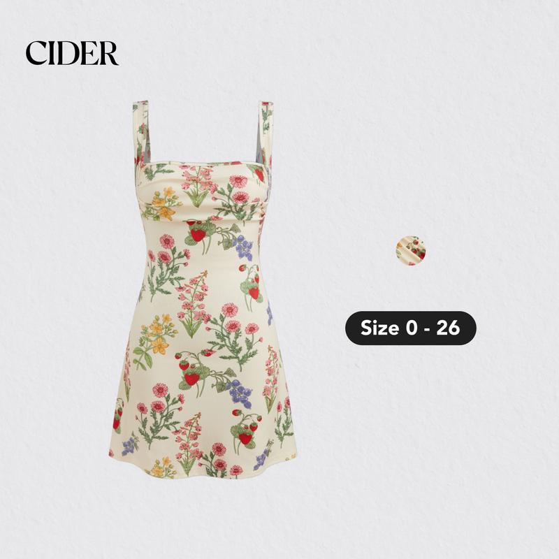 5. Cider [size 0-26] Square Neck Floral & Fruit Graphic Mini Dress, High Stretch Sundress for Women, Summer Dress for Vacation & Garden Party, Pinterest Girl Picnic Outfit, Womenswear