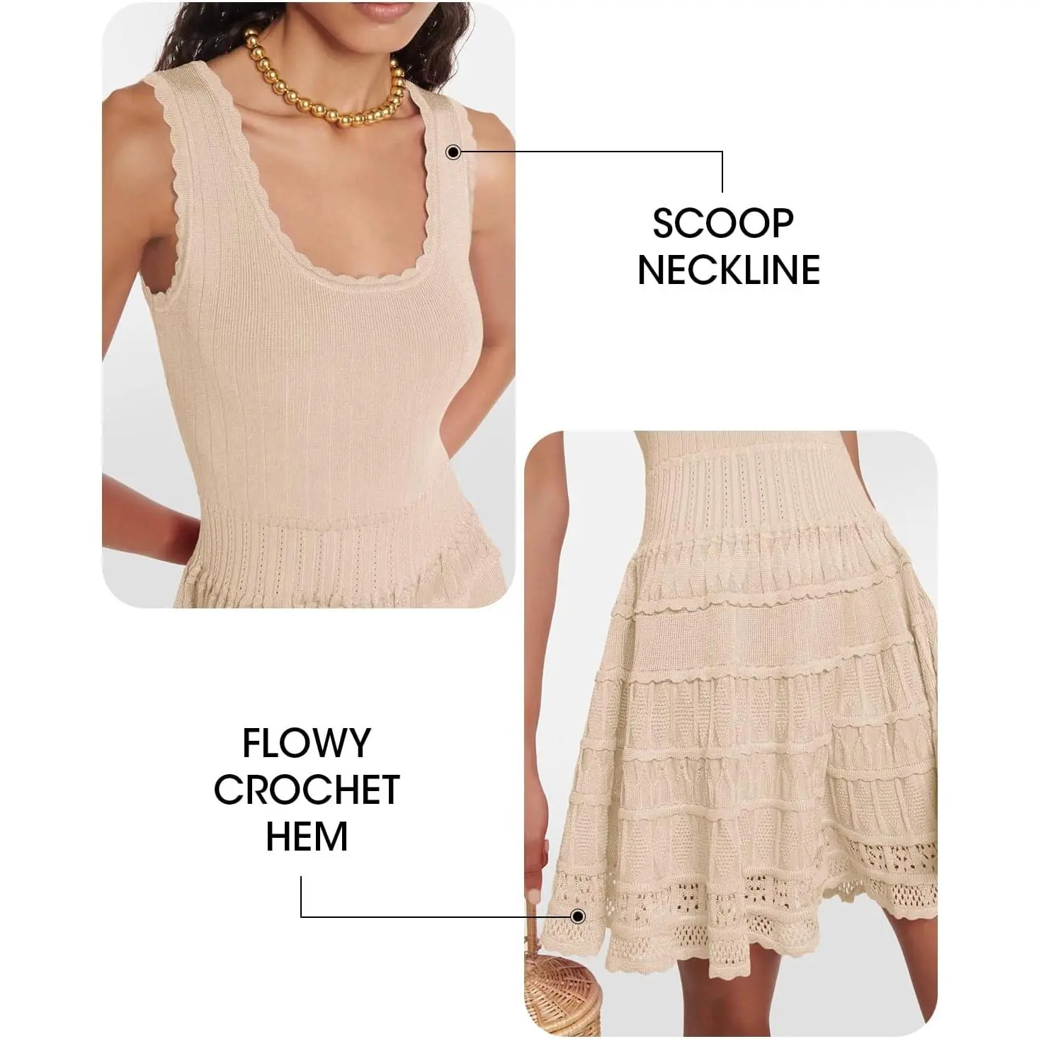 ·Knitted crochet hem adds a touch of femininity and uniqueness: Stand out from the crowd with the intricate knitted crochet hem on our mini dresses. This beautiful detail adds a feminine and bohemian touch to your outfit, elevating your summer style. The delicate craftsmanship of the crochet hem showcases your individuality and sets you apart with its unique charm.