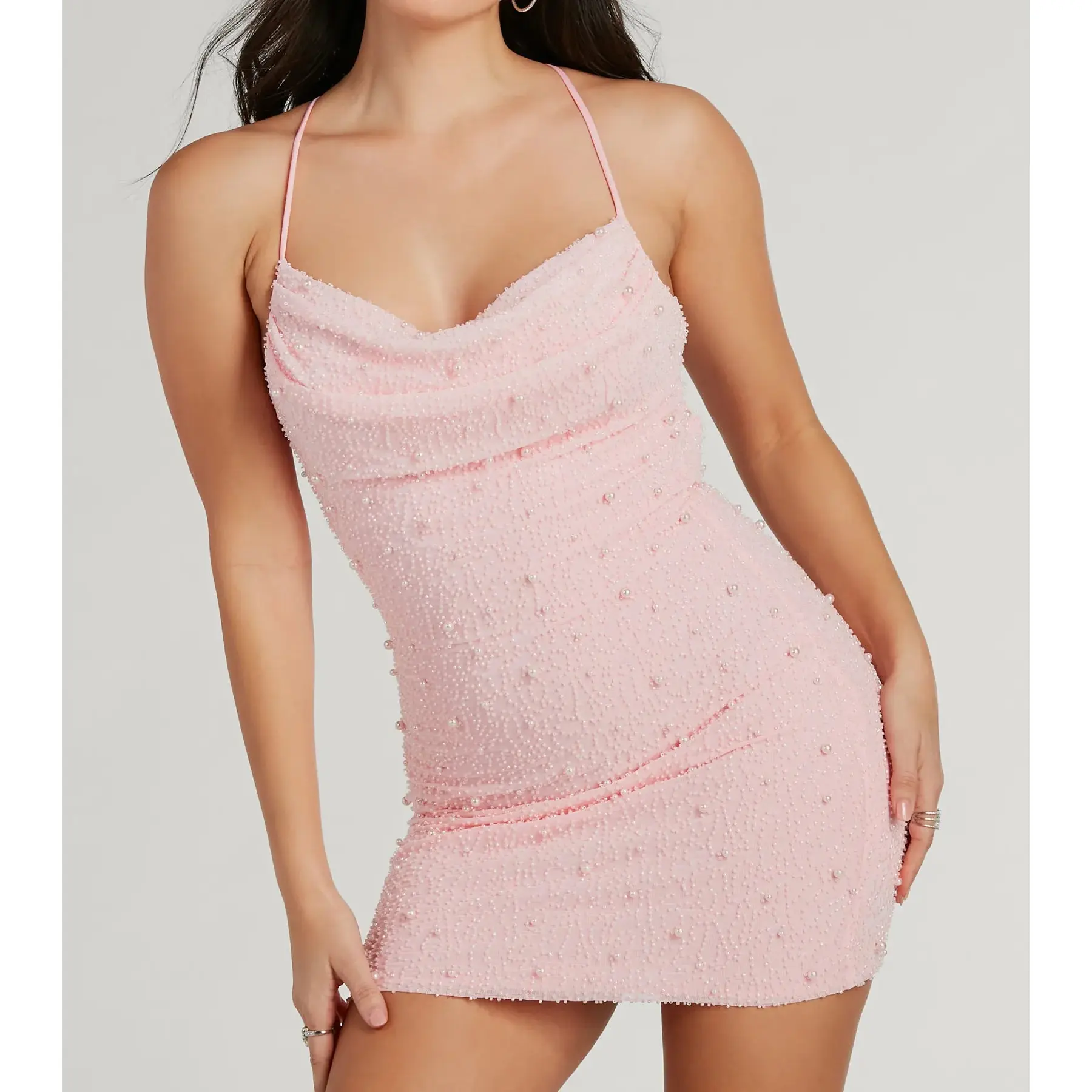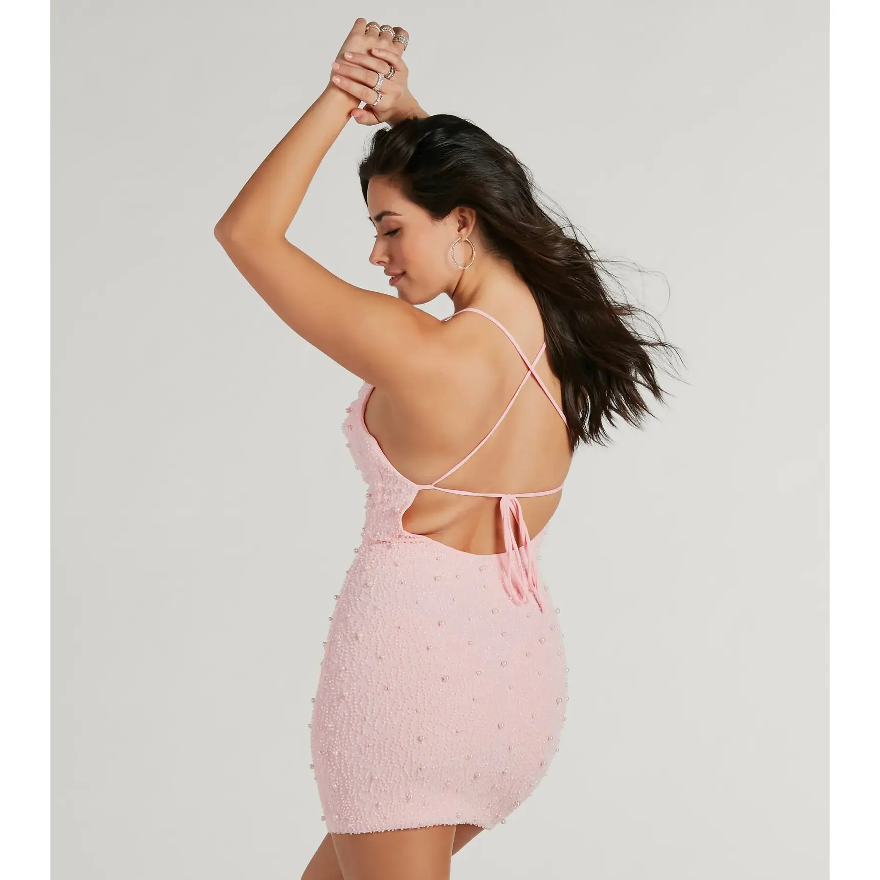 A mini dress that brings the luxe sensation! The Keira faux pearl short dress is a stunning style with a strappy tie-back design and a bodycon silhouette that highlights your figure.