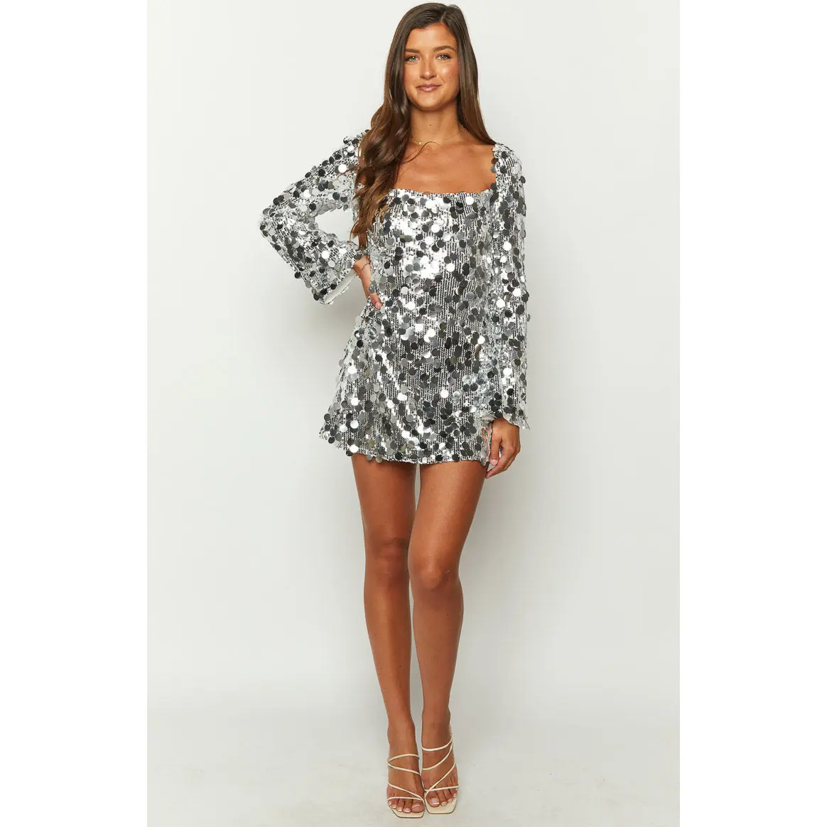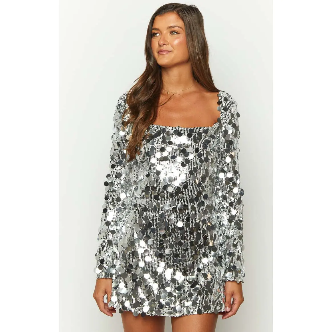5. Marienne Silver Large Sequin Long Sleeve Mini Dress