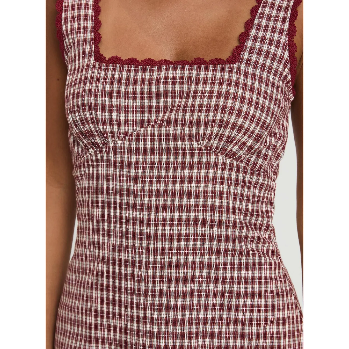 ·Square neck, ruched bust, fixed straps, zip closure at back