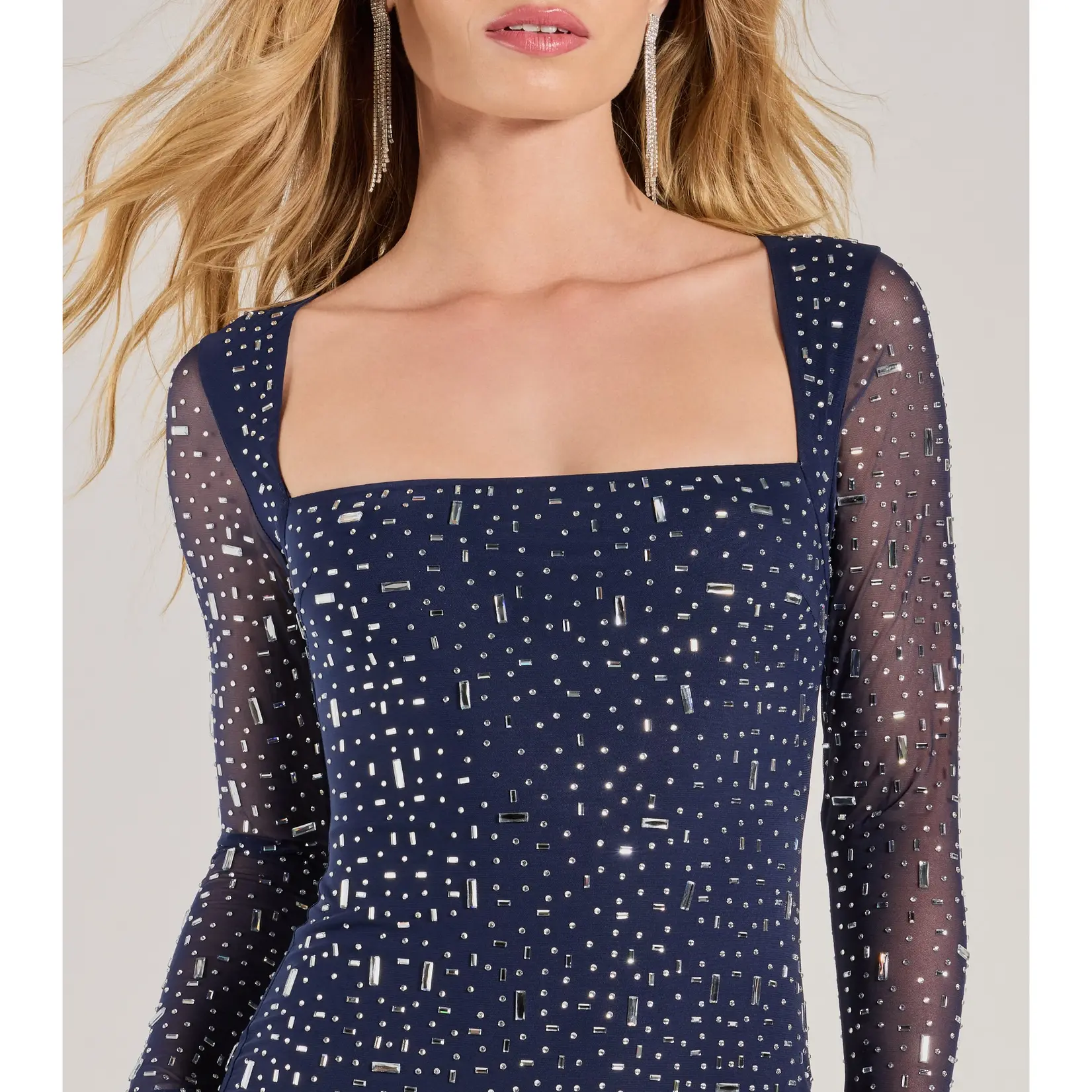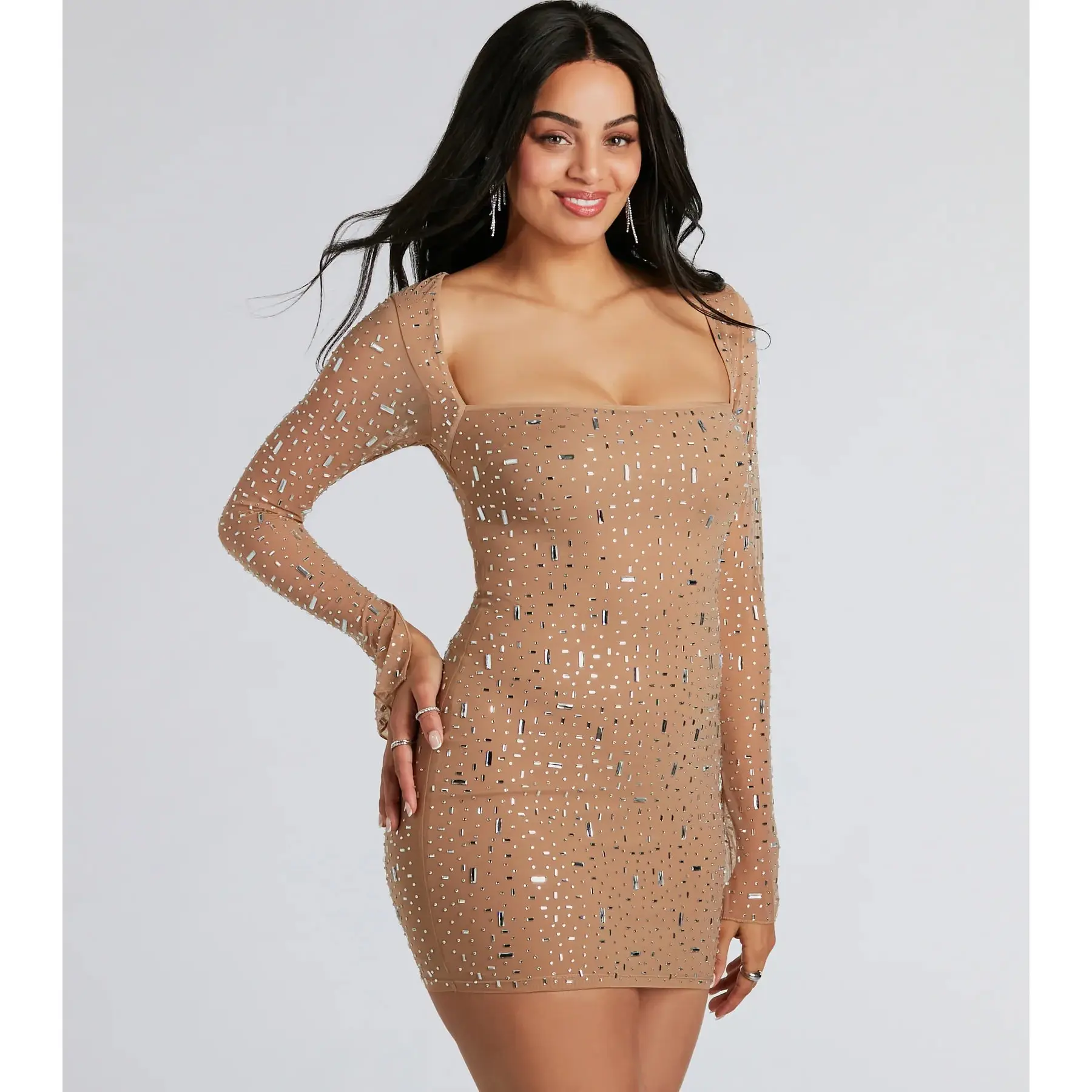 Bring the dazzling glamour to the party in this long sleeve rhinestone mesh mini dress! Designed with a stretchy sheer mesh fabric with a partial knit lining, the mini-length dress is accented with all-over rhinestone embellishments for a gorgeous and chic shine. The square neckline shapes the bodice, and the unlined long sleeves have slit accents and flare out for a trendy look. The bodycon silhouette will hug your gorgeous curves. Style this mini dress with rhinestone heels for all the more sparkle.