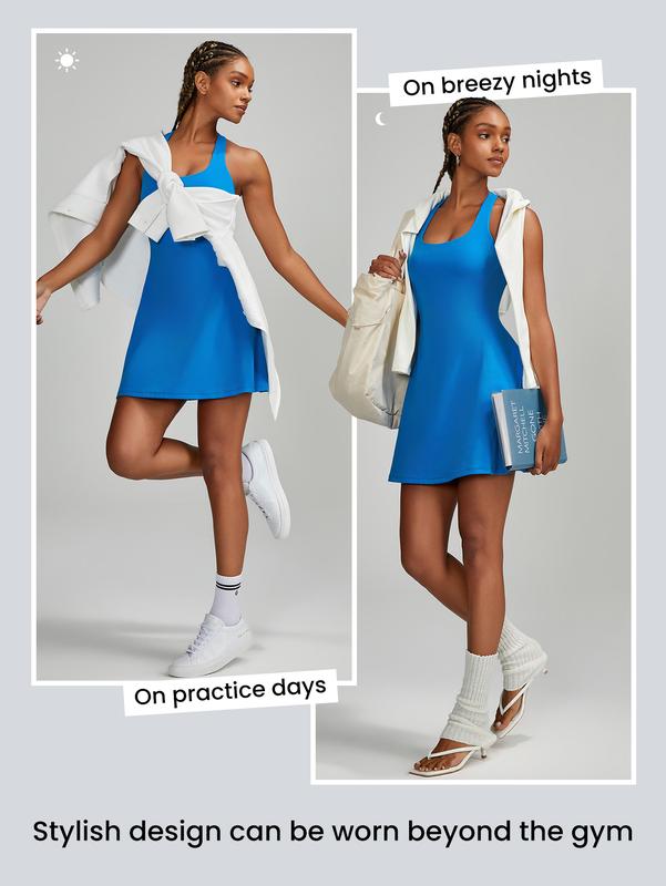 Tips: Due to packing and shipping, your FeatherFit item may arrive creased. This can be easily removed by washing or steaming before wear. Pro Tip: Designed for light support and low-impact activities, from Downward Dog to dog walking. Step onto the court in this figure-flattering mini dress designed with a square neckline, removable cups, and crisscross shoulder straps with adhesive technology. Built-in romper shorts with side pockets allow for easy restroom access while the non-slip strip at the hem keeps everything in place during activities."