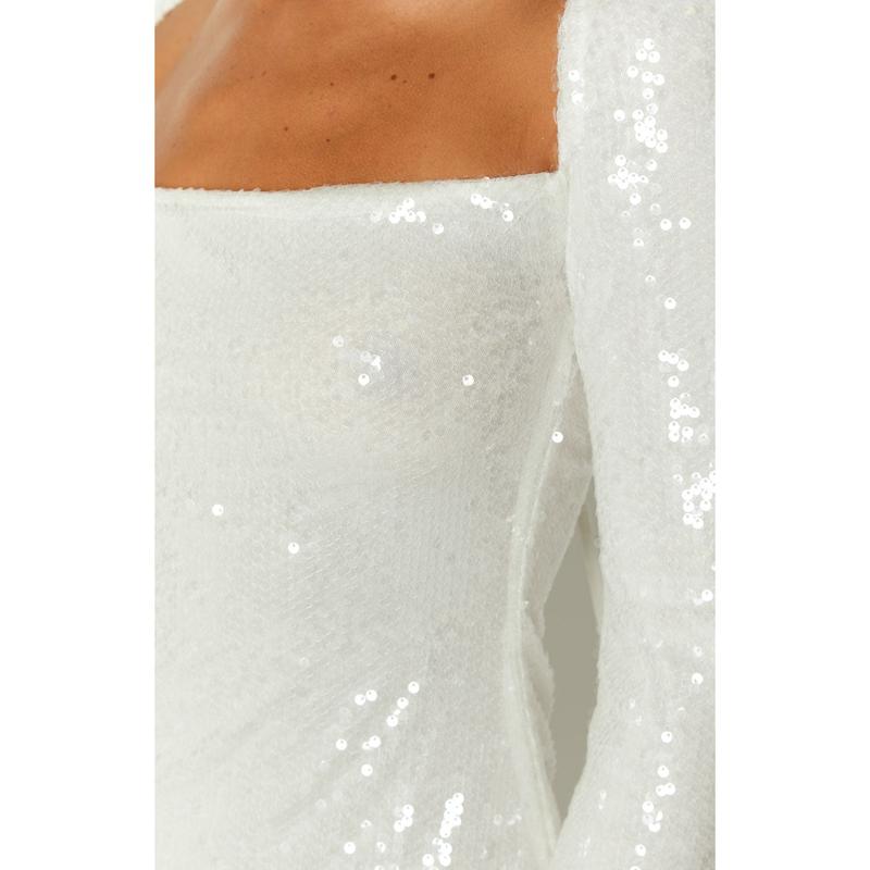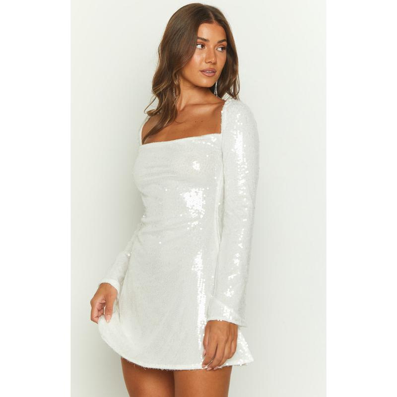 Ā·Our bestseller but with glam! Our Marienne Dress now comes in a stunning white sequin design. Add heels and dainty jewellery for a jaw dropping outfit.