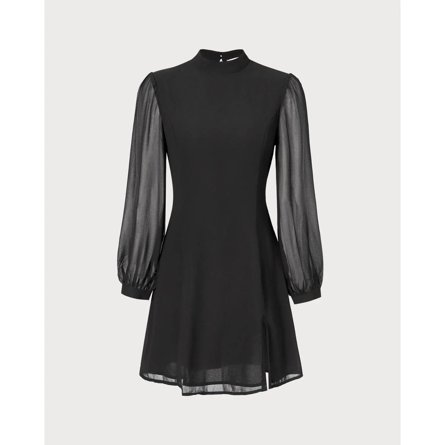 The Black Stand Collar Sheer Slit Mini Dress