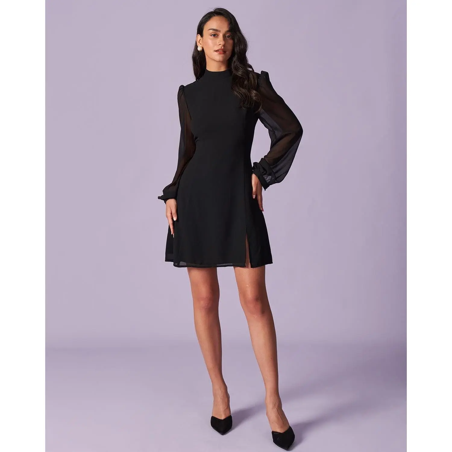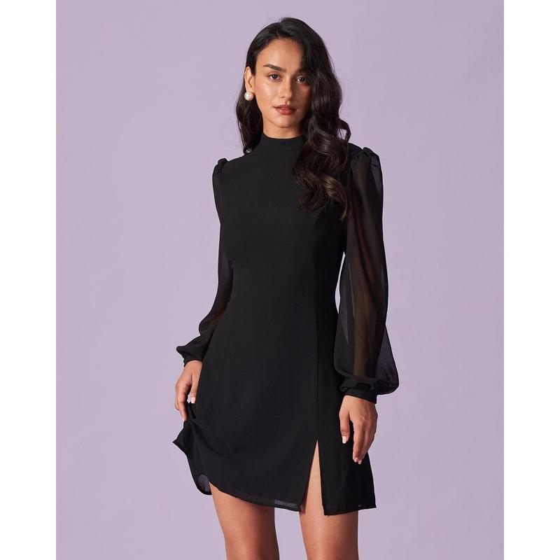 Chic and timeless, this black sheer slit mini dress with bishop sleeves is perfect for any night out or special occasion. #LittleBlackDress #DateNightOutfit #EveningStyle #ChicFashion #PartyLook