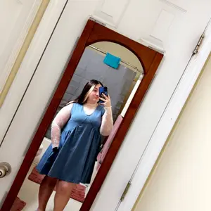 So cute! And the material is really nice! Plus the pockets are huge! It’s very flattering on a bigger body and looks cute by itself or with a jacket or sweater… I have the grey blue and the burnt orange and both are cute!
