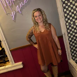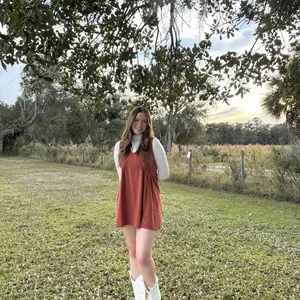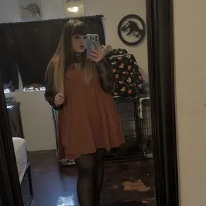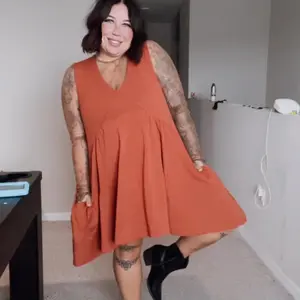 This dress would be 5 starts but I feel like it’s bright orange vs a rusty color. The quality and material are amazing though and it’s super comfy. Also size down a size. It runs pretty large.