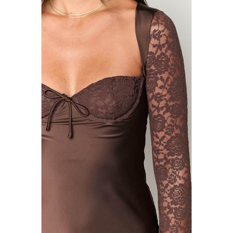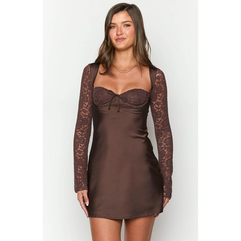 Brown Long Sleeve Mini Dress How to style: Make a statement in this stunning mini dress featuring the sweetest lace details! Our Viola Brown Long Sleeve Mini Dress is perfect for your next night out or date night. Elevate the classy silhouette with some gold jewellery and strappy heels for a stunning look! Features:
