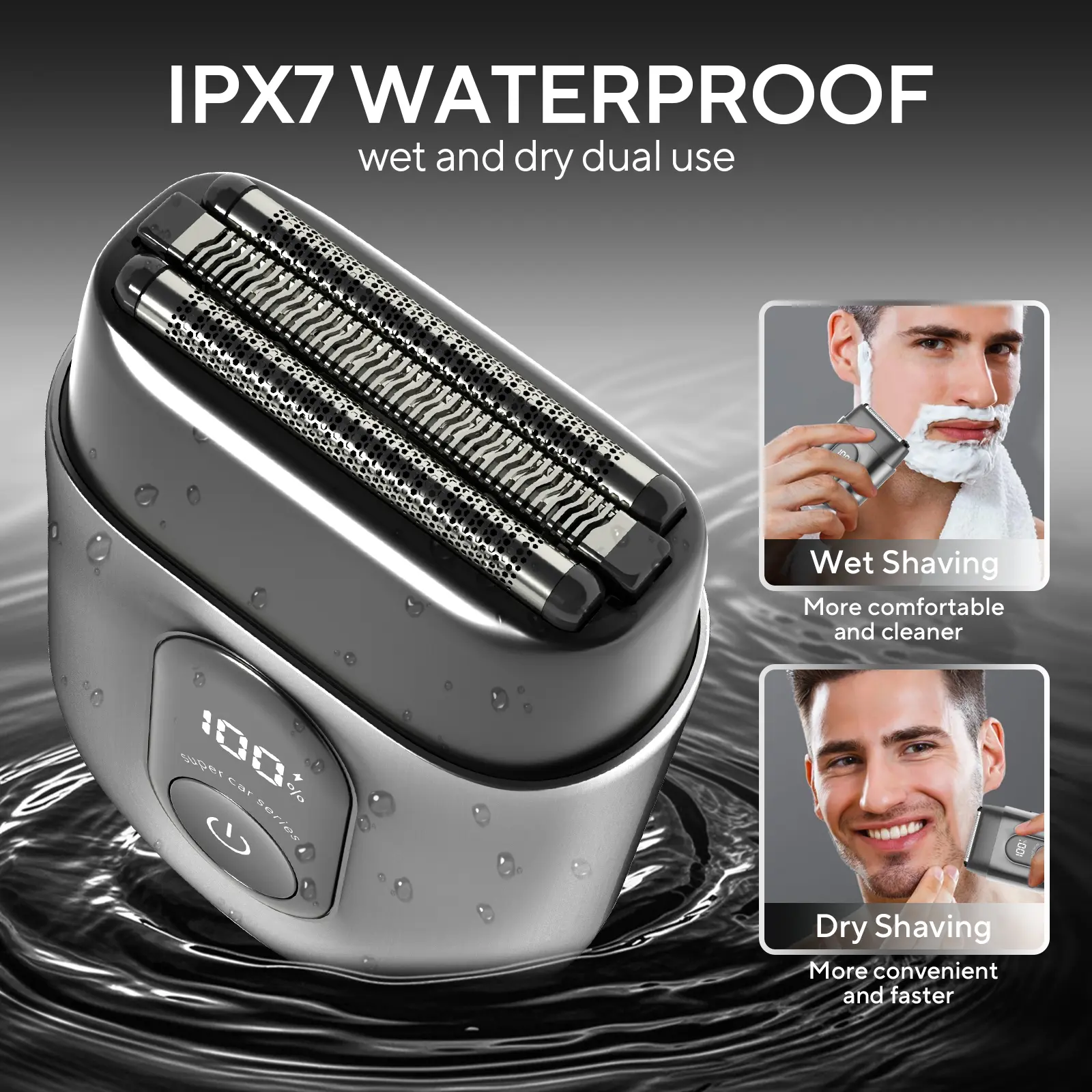 This convenient shaver supports wet and dry use with full body waterproof function, and comes with LED display and smart travel lock design. The lock can be activated or deactivated by long-pressing the power button for 3 seconds, and the LED screen displays a 3-second countdown timer to ensure safety and portability on the go.