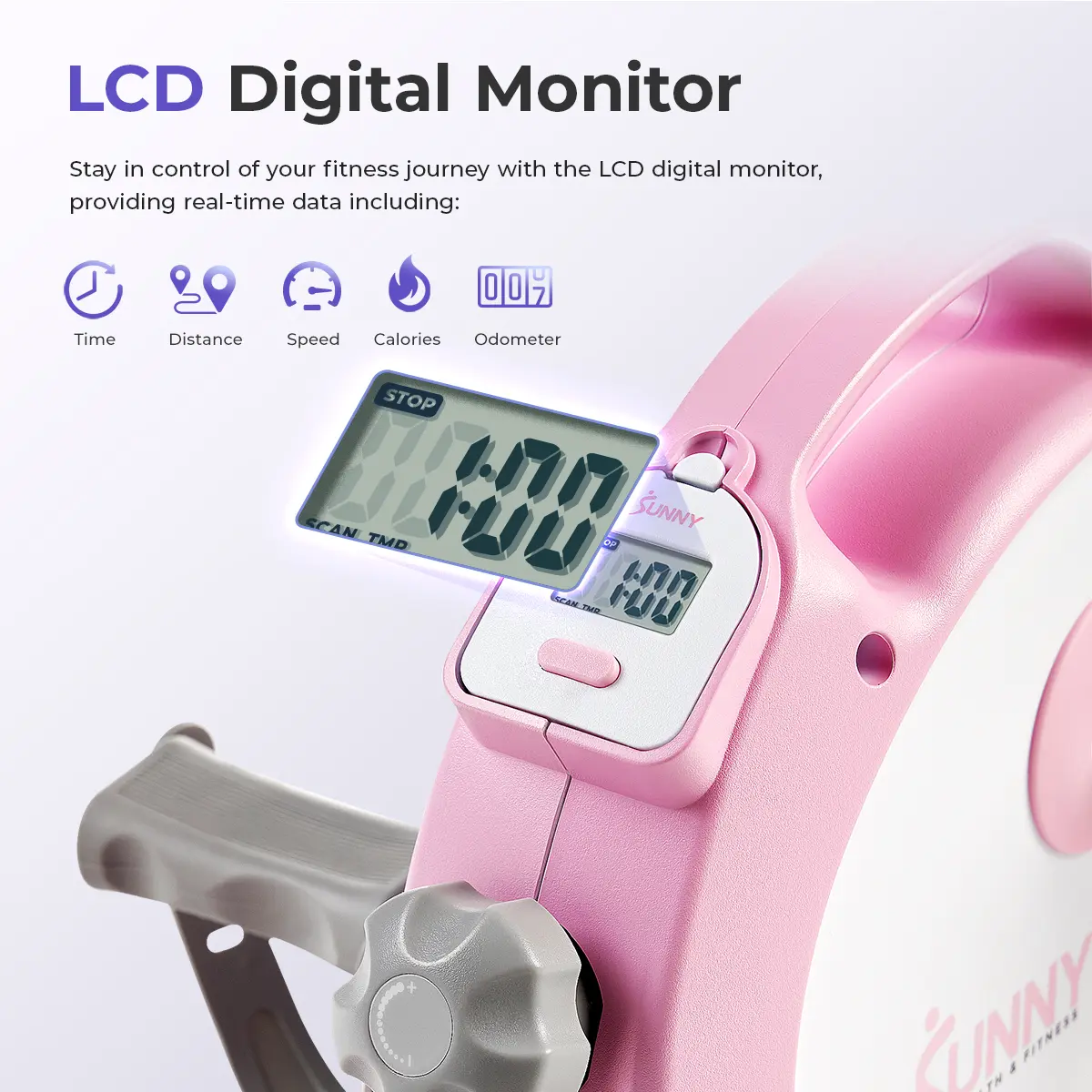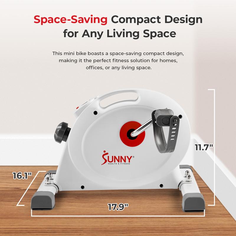 Discover the Sunny Health & Fitness 2-in-1 Mini Exercise Bike. This innovative pedal exerciser provides low-impact workouts without joint strain. Perfect for office staff, seniors, athletes in recovery, and physical therapy patients. Its versatile design caters to leg and arm workouts, meeting your entire body's fitness needs. Experience the convenience of a compact and portable build, making storage and transportation easy.