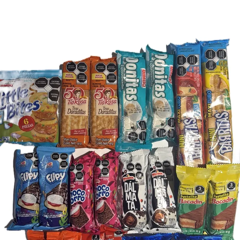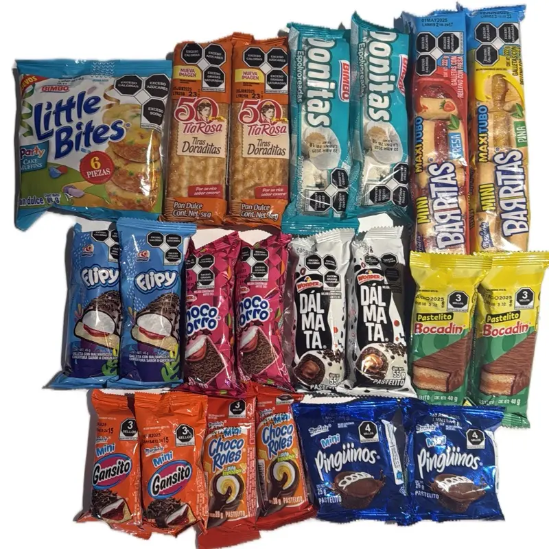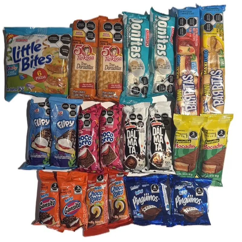 Mini favorites! 22 pieces! All your favorites from Tia Rosa and Bimbo. Little Bites, Doraditas, Donitas, Mini Barritas, Flipy, Dálmata, ChocoTorro, Bocadin Pastelito, Gansito, Pingüino and ChocoRoles.