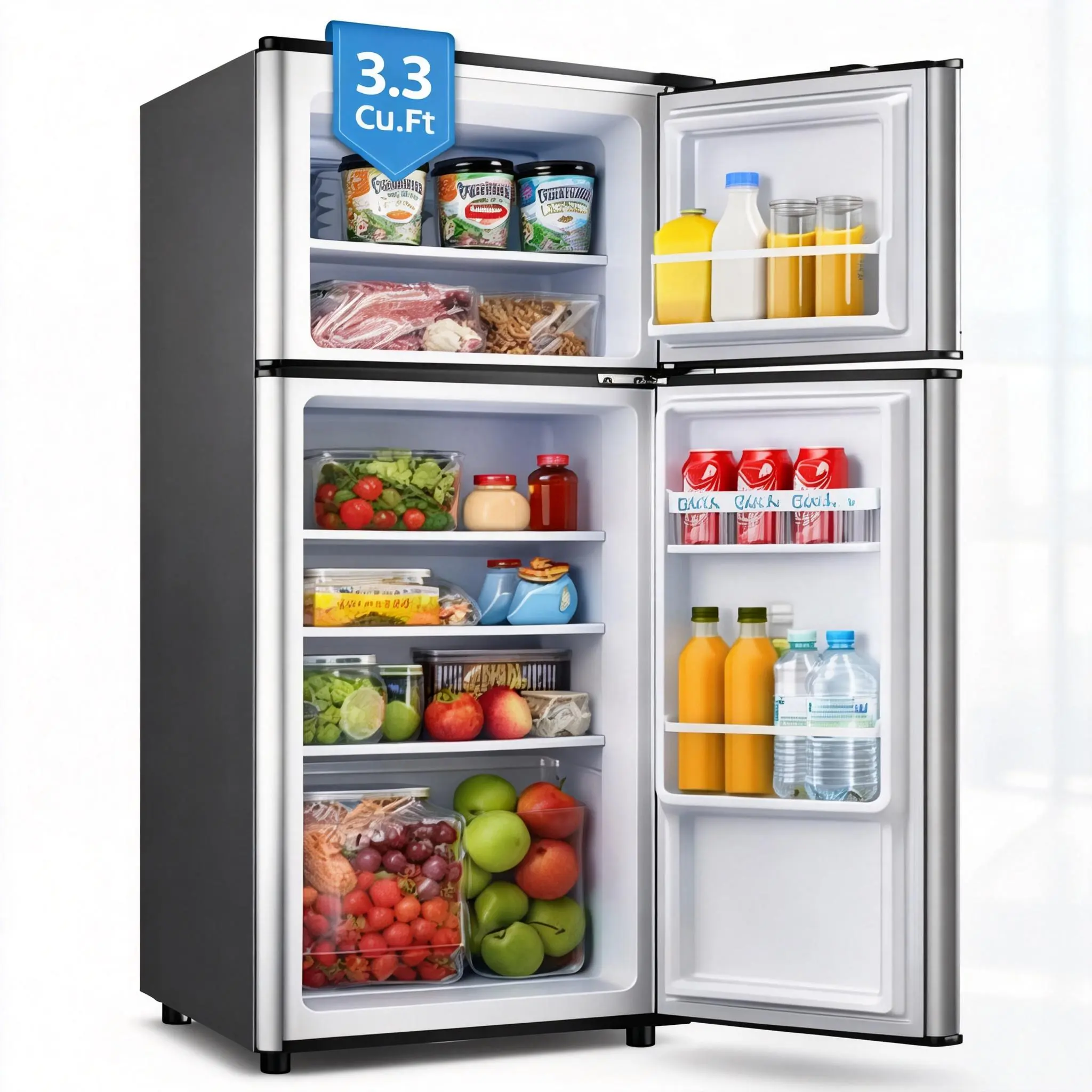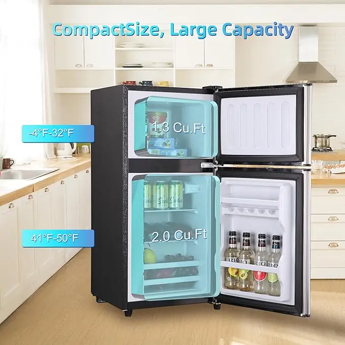 ·【Space-Saving Design with Generous Capacity】Discover the perfect blend of compactness and ample storage. Measuring just 18 x 18.3 x 35.95 inches, this refrigerator fits seamlessly into any living space while offering a total capacity of 3.3 cu. ft. The larger 1.3 cu. ft. freezer section and 2.0 cu. ft. refrigerator section provide plenty of room for all your essentials.