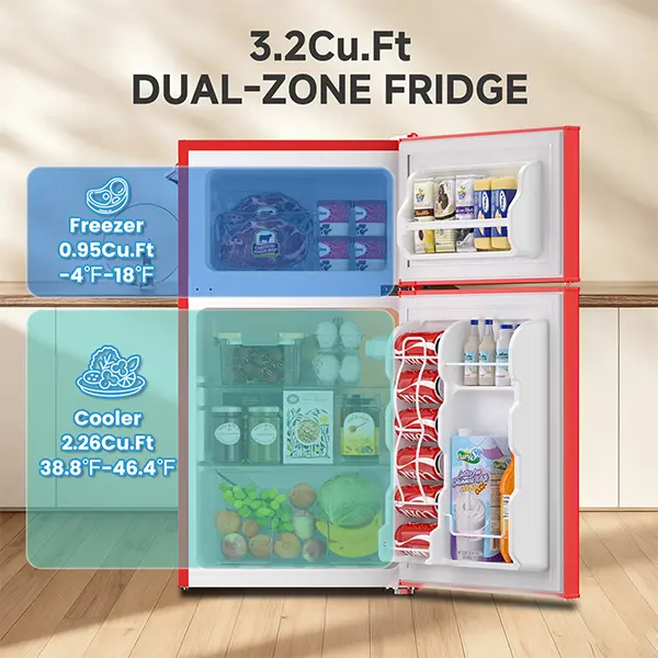 ·Space-Saving & Spacious: Compact size (17.9"x19.68"x34.01") with 3.2 cu.ft capacity, featuring separate storage to keep drinks, fruits, and veggies fresh.
